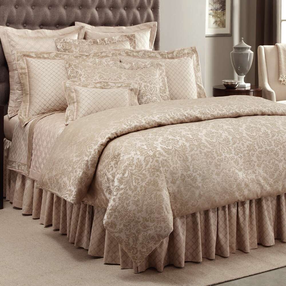 Bed Skirts: Allover Diamond, available gathered or tailored, with three panels, 3” platform strips, a 14” drop and a plain hem finish.