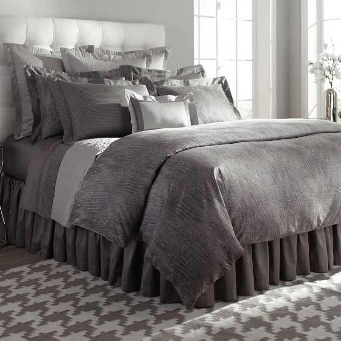 A handsome, contemporary collection of 600 thread count, Italian jacquards that are available in Geometric and Reptile patterns in a timeless Slate Gray color palette.