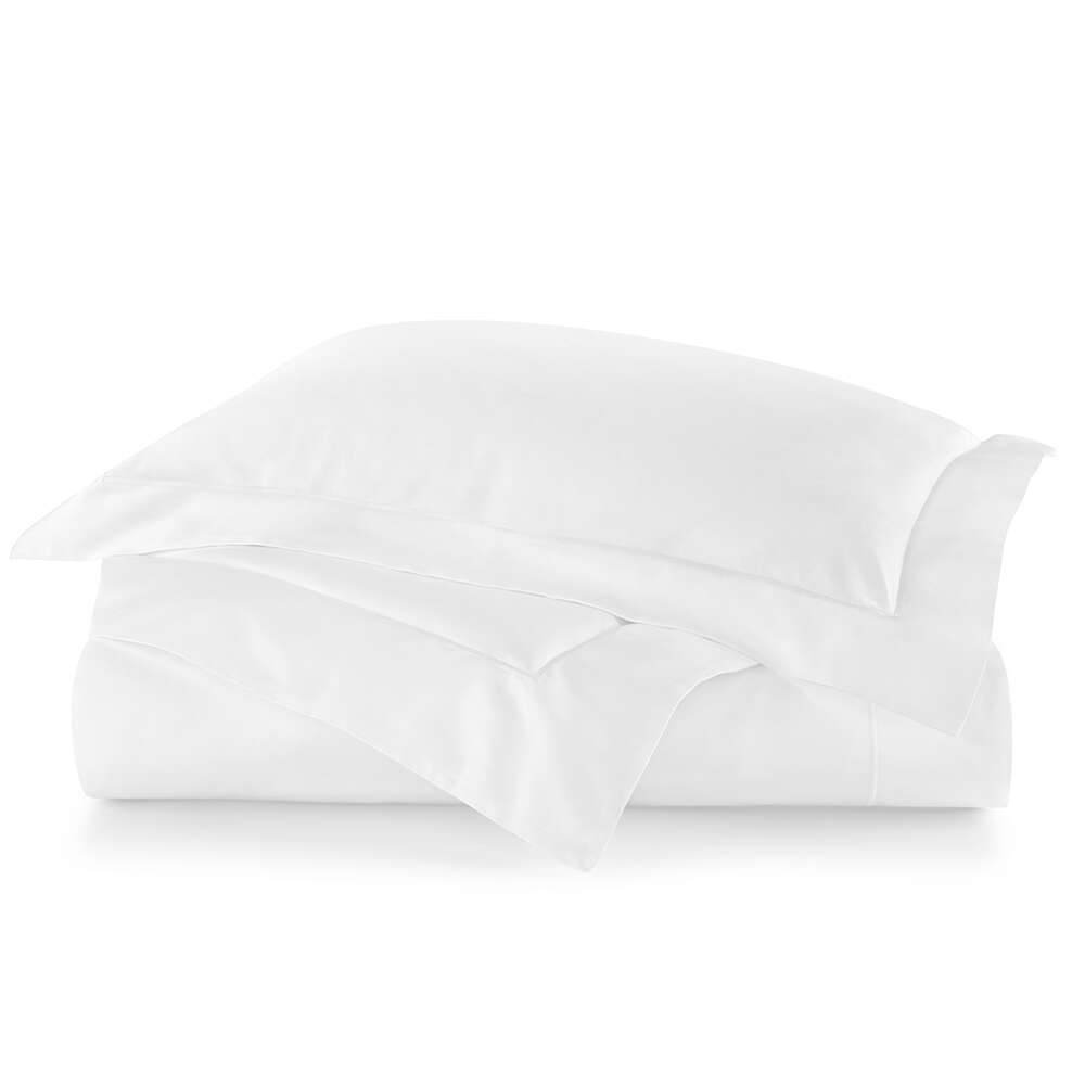 Duvet covers are constructed with a 4" flange on 3 sides with a knife edge finish at the top and a button closure on the back. Feature a single row satin stitch embroidery on the hem. Duvet ties sewn into each corner.