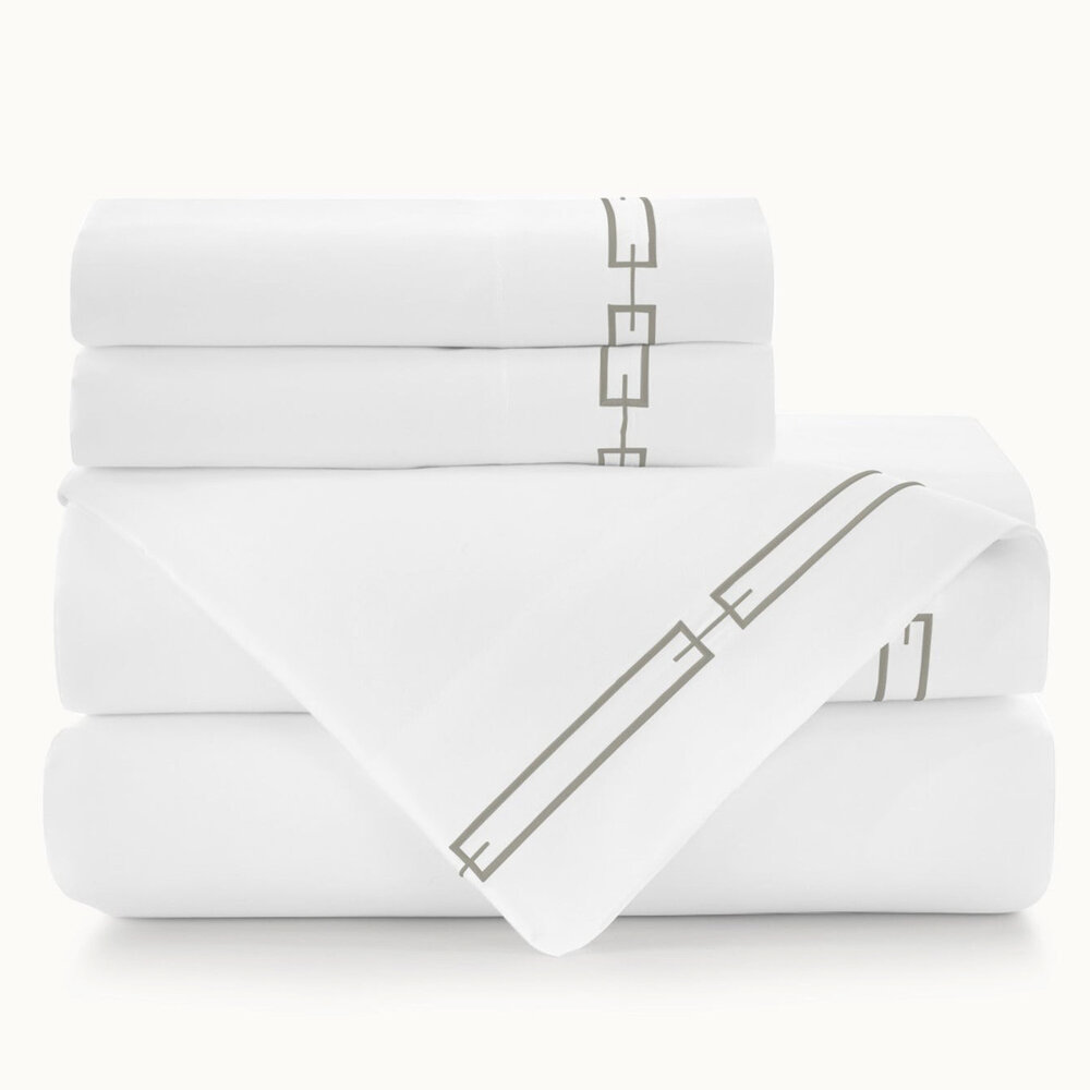 Flat sheet and pillowcases feature a contemporary geometric link design embroidered on the 4" cuff of both.