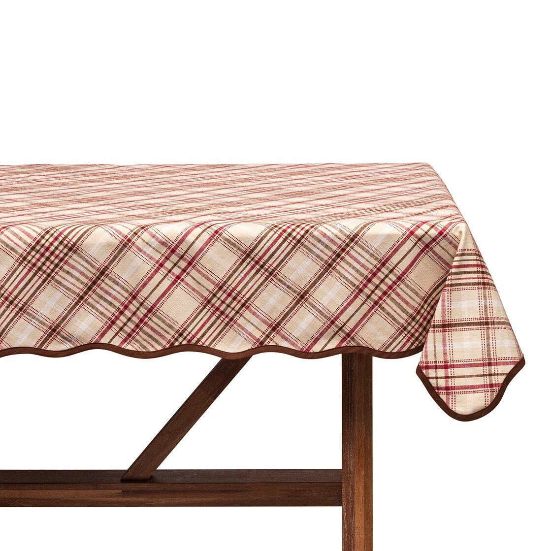Inspired by the rich hues of harvest season, woven cotton in mulberry, chocolate, and cream is elegantly tailored on the bias and trimmed with a sumptuous, scalloped edge, to transform your table for autumn gatherings and Thanksgiving feasts.