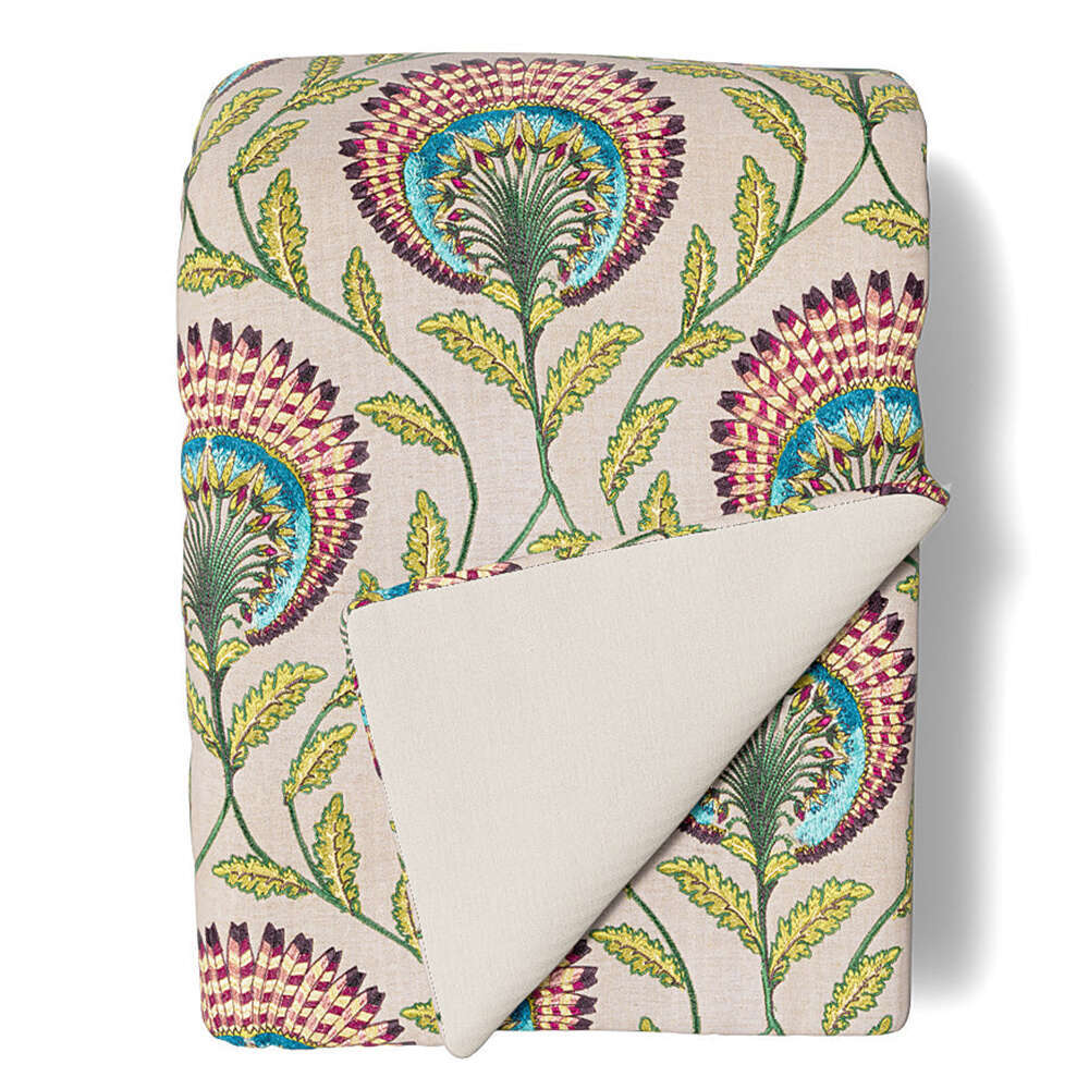 Inspired by a 16th century Ottoman dish, this design means 'peacock' in Turkish. Embroidered on a herringbone ground in many colors, with decorative clipped fringe.