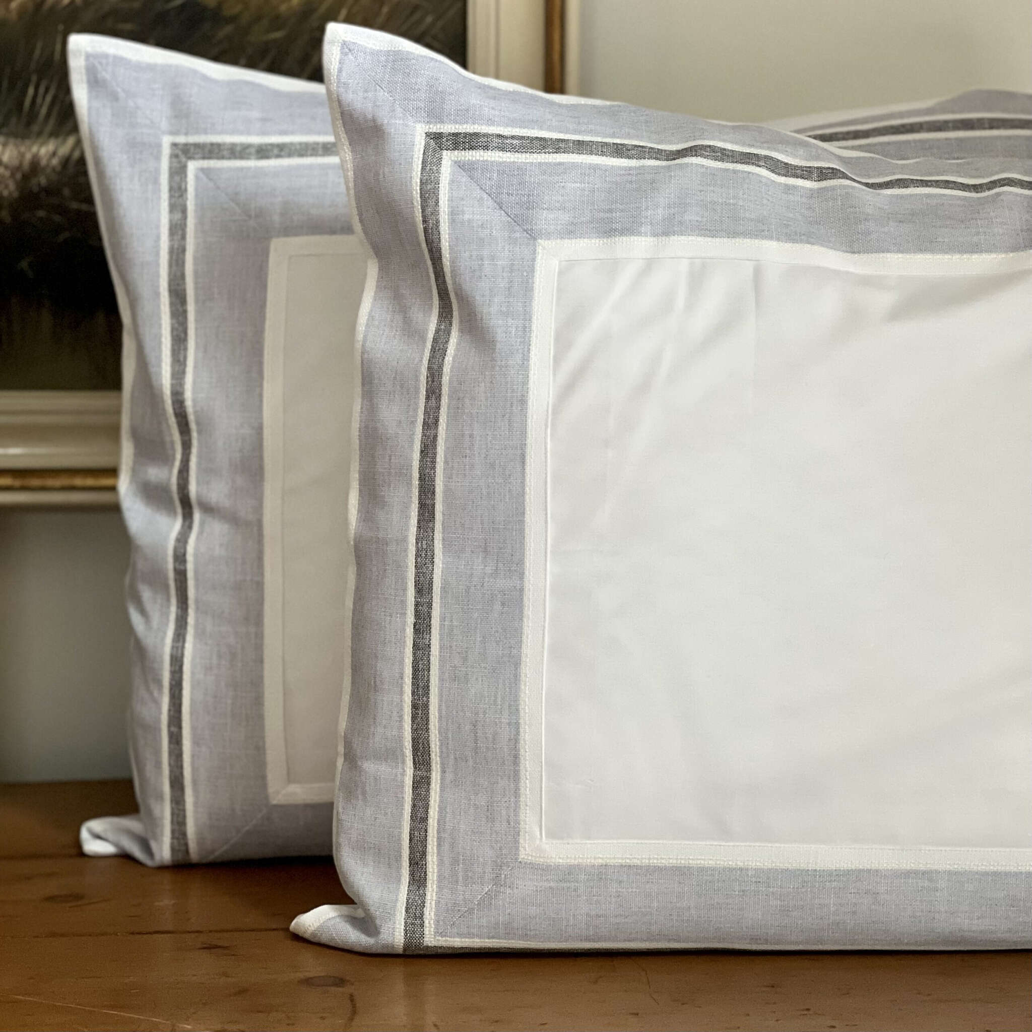 Tenerife features a wide band of linen expertly applied to the outside edges of our shams and applied as a U on top of the duvet cover. There is a beautiful heathered subtlety to both the Taupe and Blue shades giving this collection an elegant edge. Base sheeting offered in Sateen or Percale.