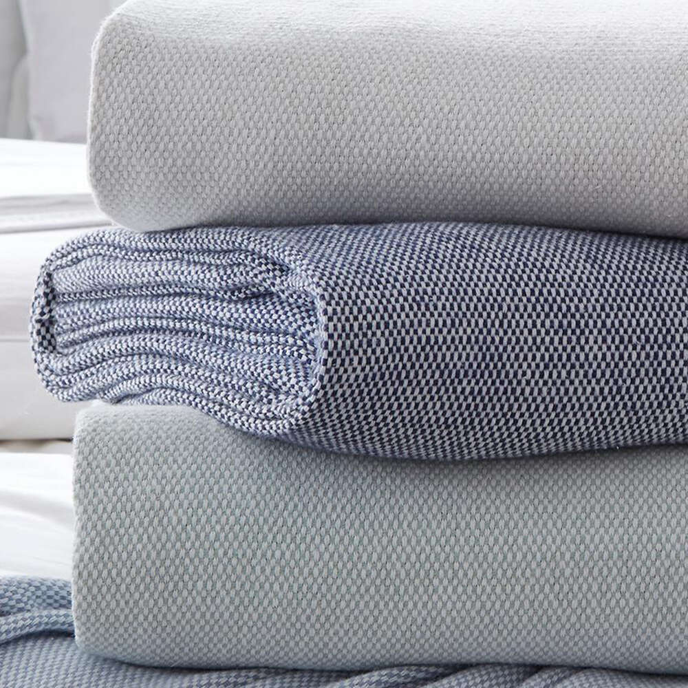 Terzo pillows and throws feature a classic basket weave pattern in soft, versatile colors that are welcoming in any room. Graceful and elegant, it is crafted from pure cotton and the pillows are filled with feather and down.