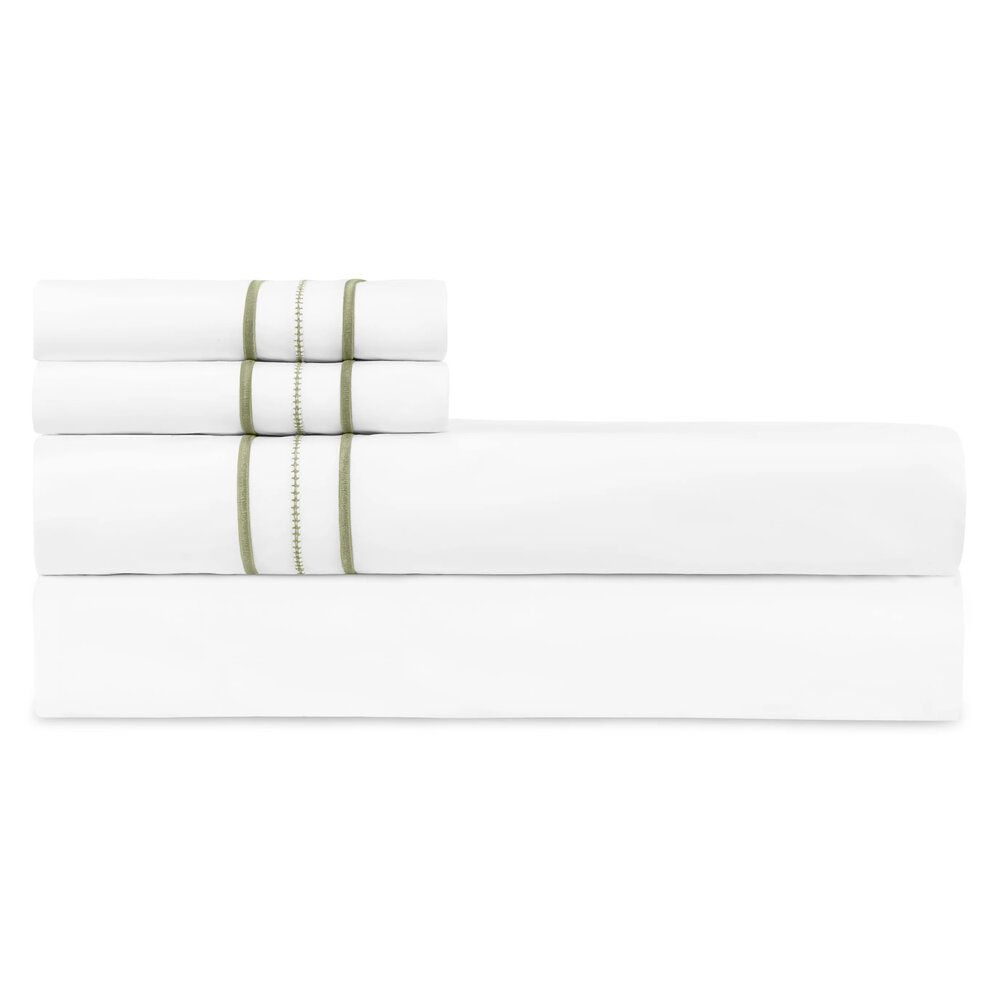 Triad Flat Sheets are designed with a solid percale body and a monochrome trio of satin stitch - hemstitch - satin stitch along the Euro return.