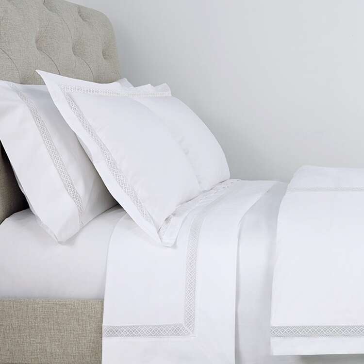 Valencia Flat Sheets are made with a solid percale body and an elegant lace applied to the Euro return.