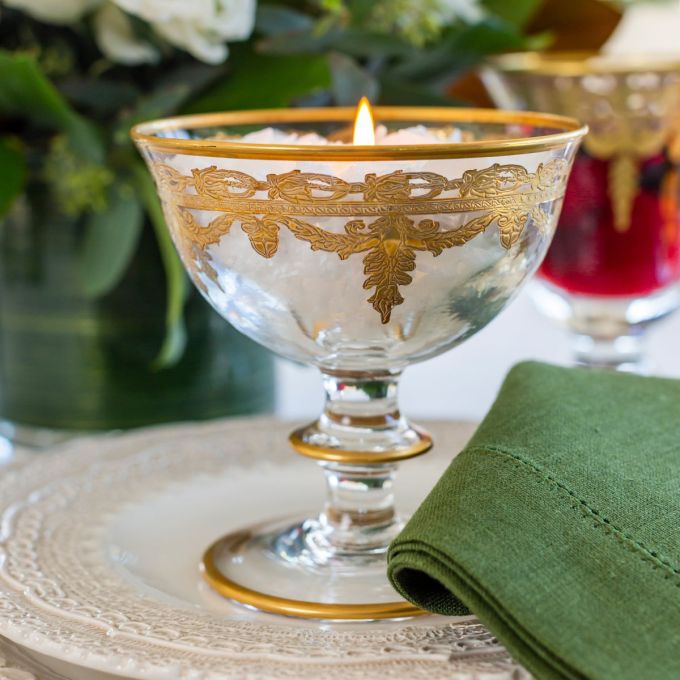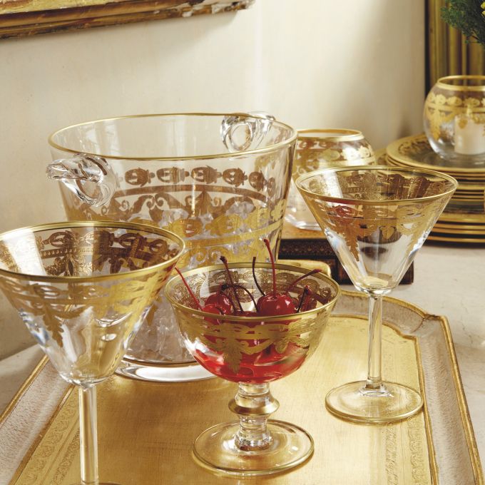 Our Vetro Gold Collection has been known to leave guests speechless. Florentine master artisans hand paint 24-karat gold highlights on intricate hand etched designs. The results are nothing short of extraordinary. One of our most popular collections. Hand made in Tuscany.