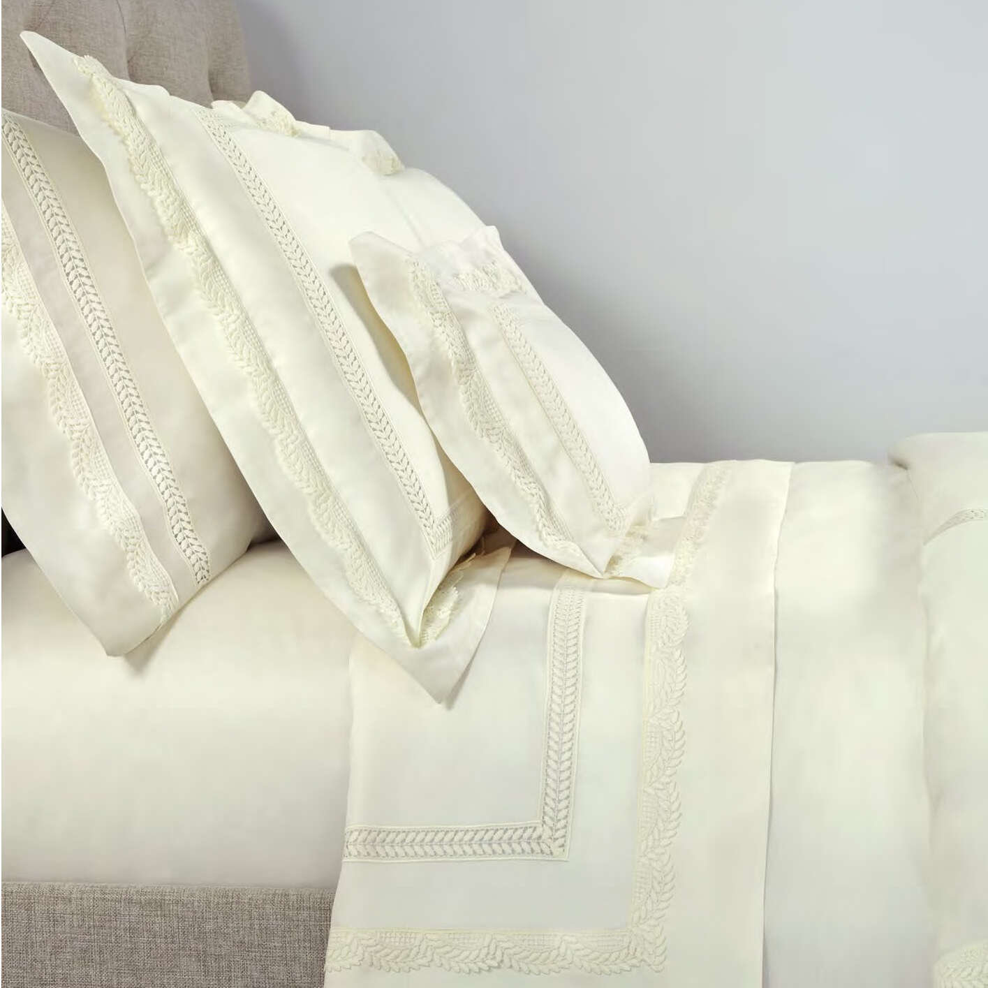 Wreath Flat Sheets are designed with a solid sateen body, with one lace applied along the Euro return and a second lace applied as an inset.