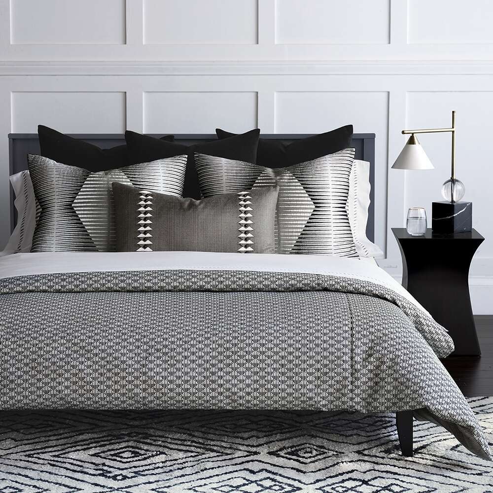 Duvet Cover: Duvet cover in geometric fabric Prado Graphite. Backed in Meridian Slate fabric. Knife edge finishing. Ties inside all four corners for easy comforter attachment. Button closure for easy care.