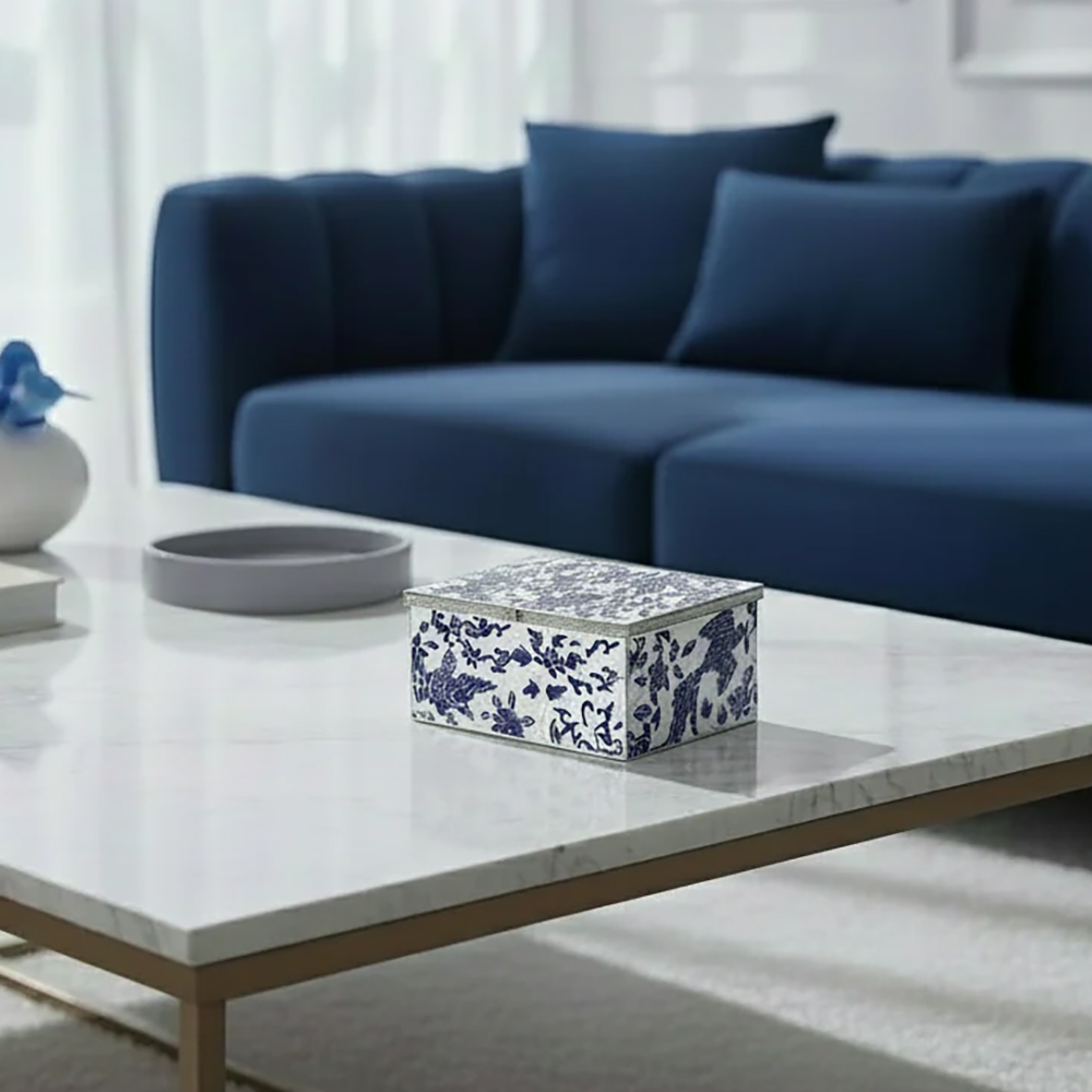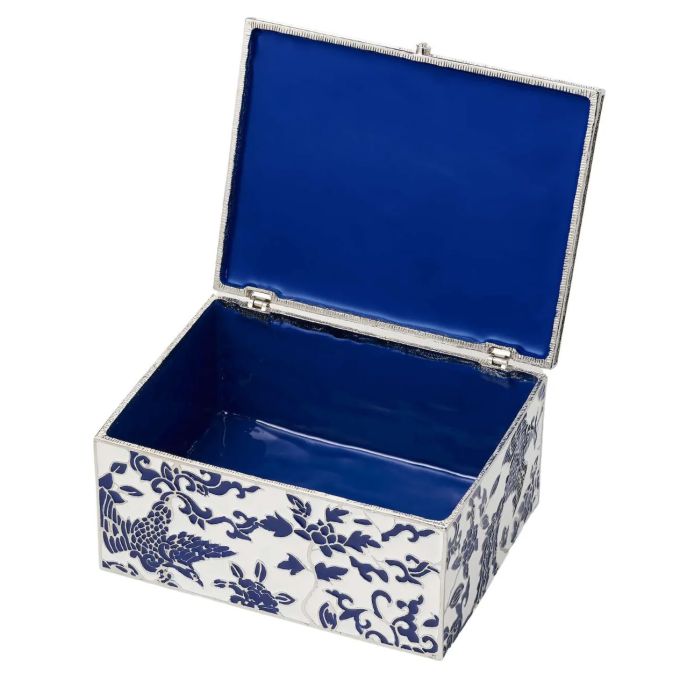Celebrating a mythical creature, long associated with nobility and transformation. Gold/Silver finished pewter chinoiserie pattern box, with intricate hand-enameling. Hinged lid with clear European crystal and hand-enameled interior. Tarnish resistant. Signature luxury gift box included.