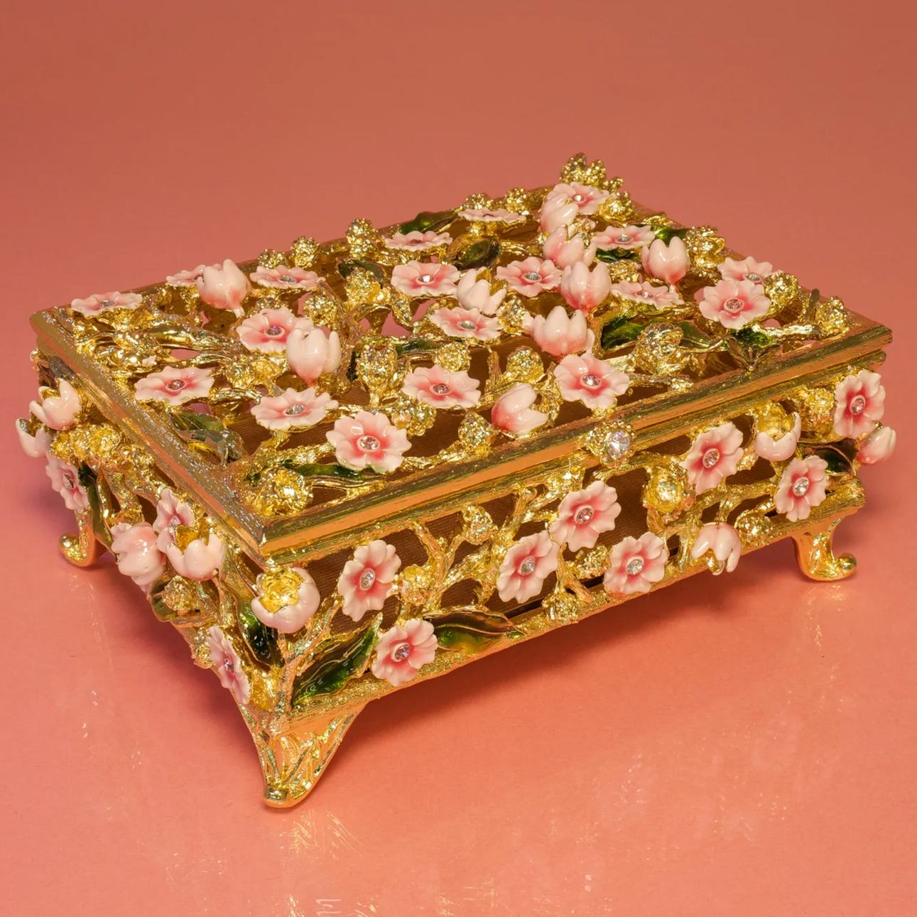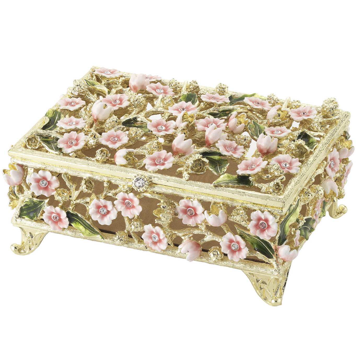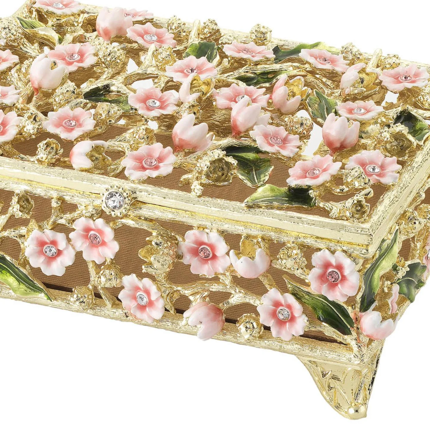 Delightful floral pattern box in gold finished pewter, with pink and green hued hand-enameling and hand-set European crystals. Elegant champagne hued moiré silk interior lining. Hinged lid. Tarnish resistant. Signature luxury gift box included.