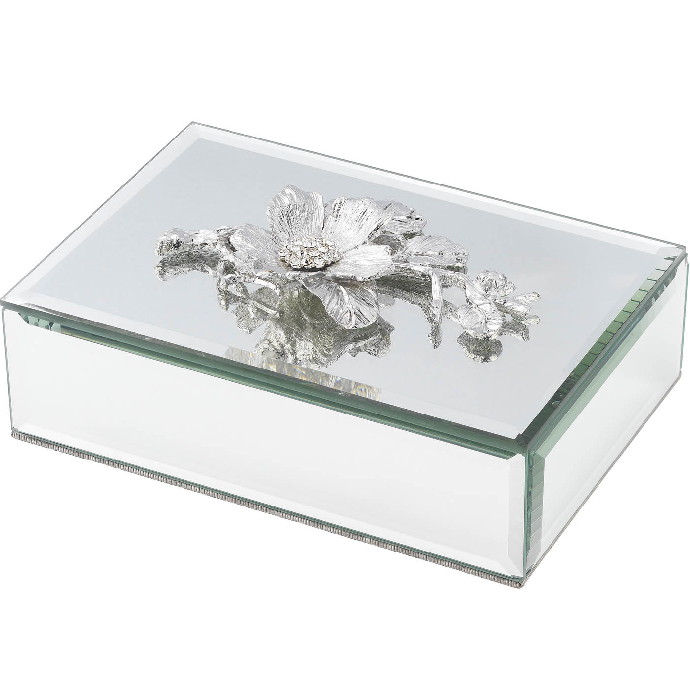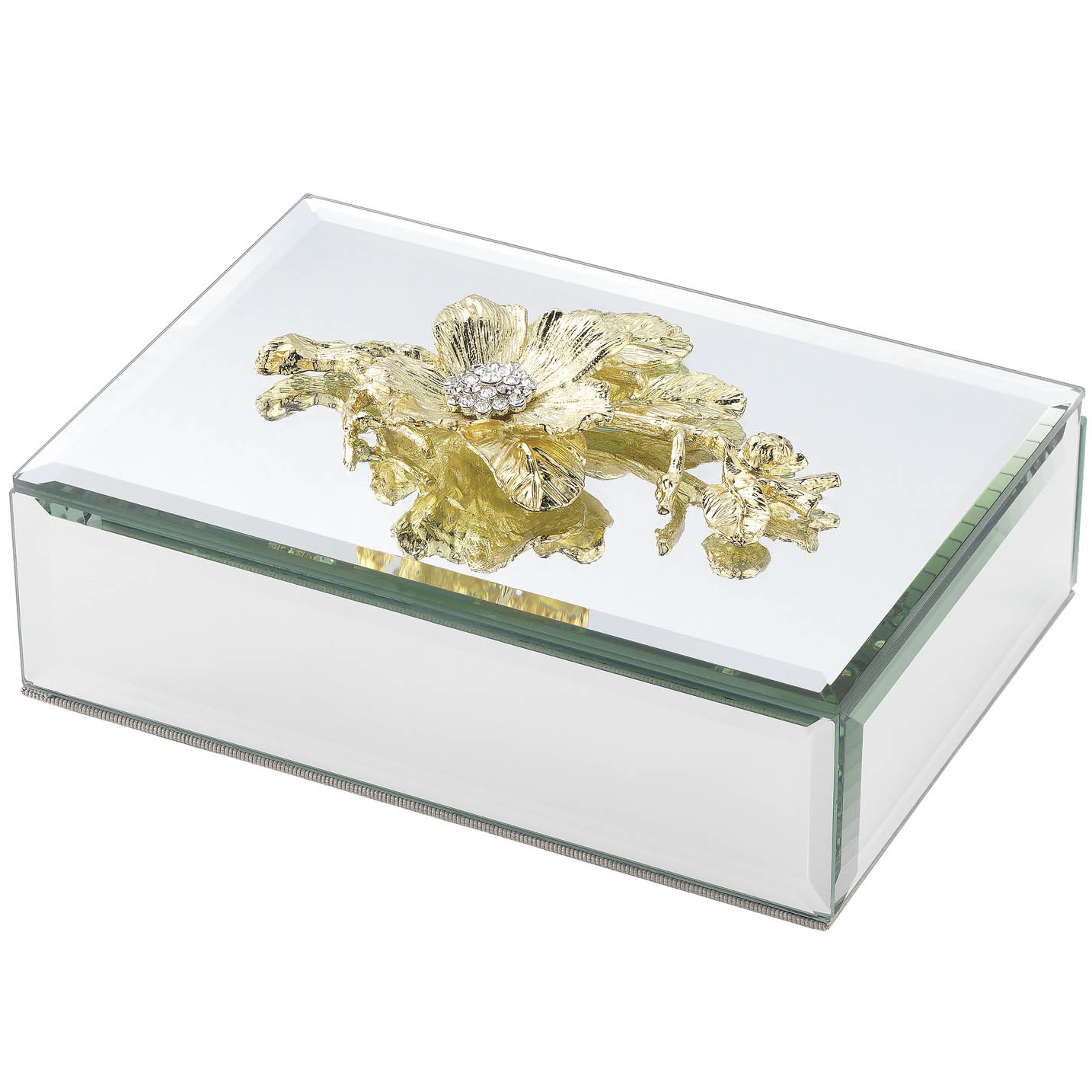 Beveled mirrored glass with gold or silver finished pewter floral adornment, inspired by the beautiful Rugosa Rose. Encrusted with hand-set clear European crystals. Hinged Lid. Black velvet lined interior. Gray moiré silk underside. Tarnish resistant. Signature luxury gift box included.