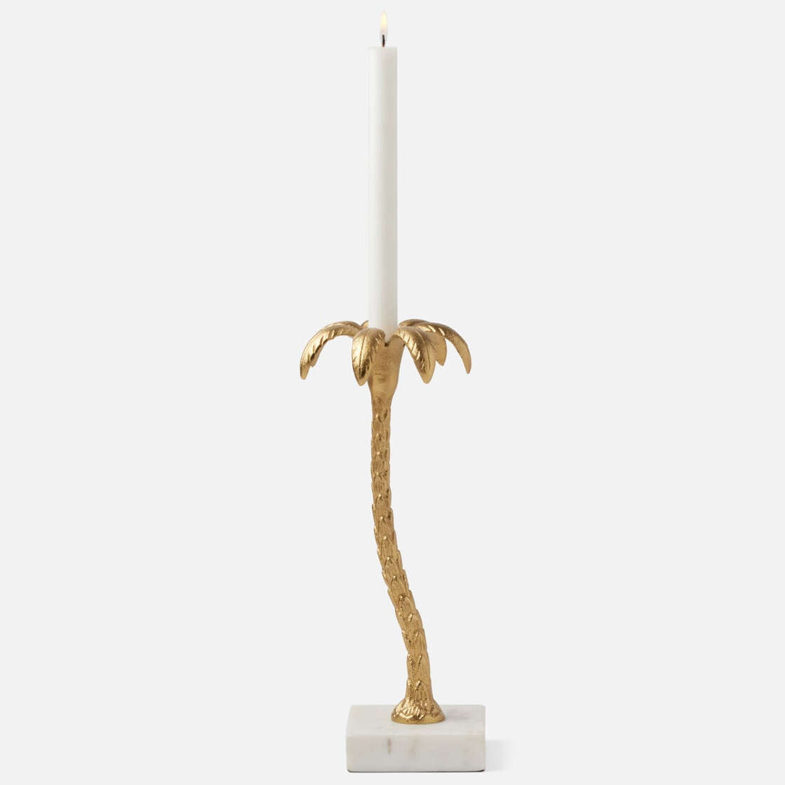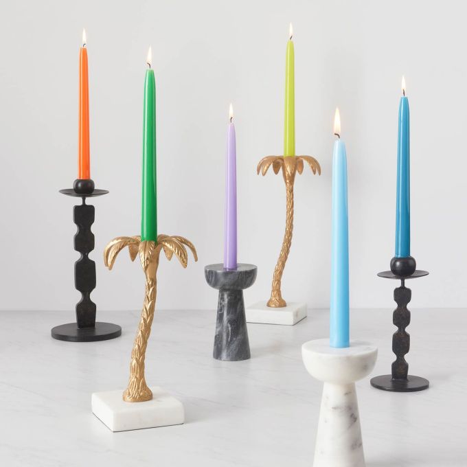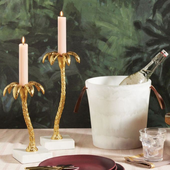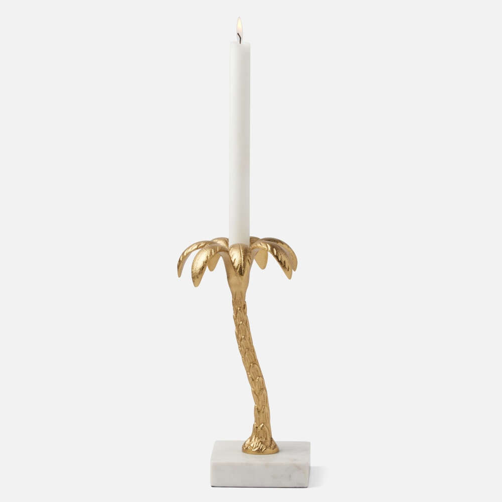 Palm trees sway over the table with our Farrah candlesticks, slightly surreal pieces available in two sizes. Each curving aluminum palm tree is finished with gold and rests on a white marble base.