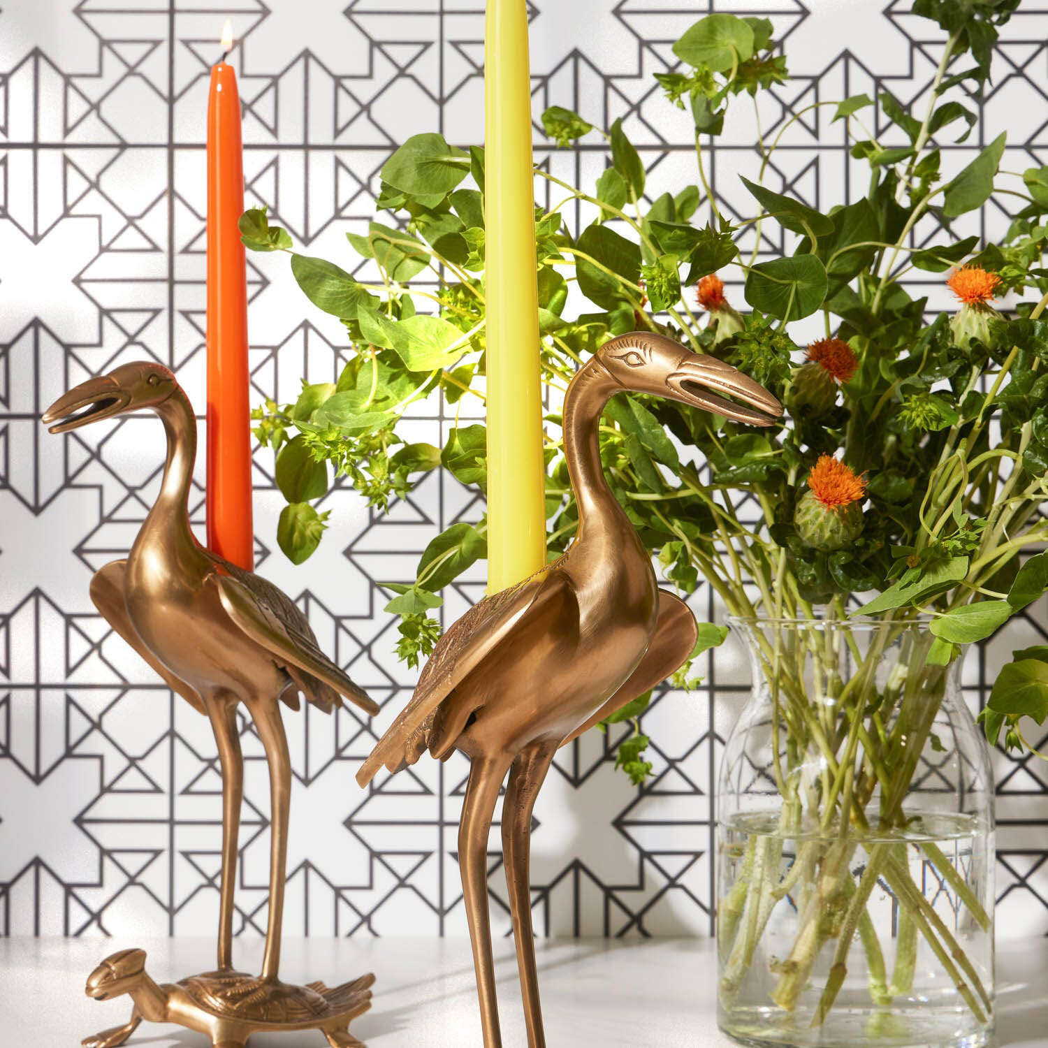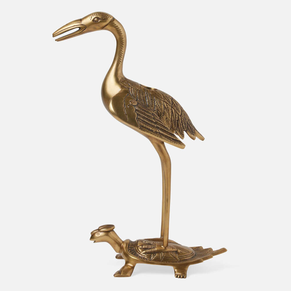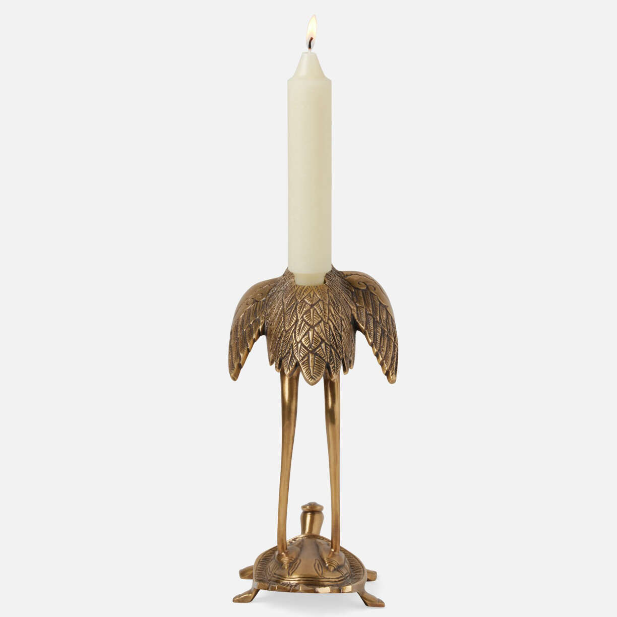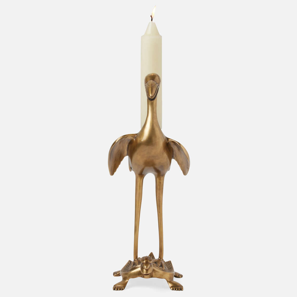 Whimsy meets nature in our Olive candle holder. A gold-plated brass piece featuring a crane-shaped candelabra, resting on a turtle-shaped base.