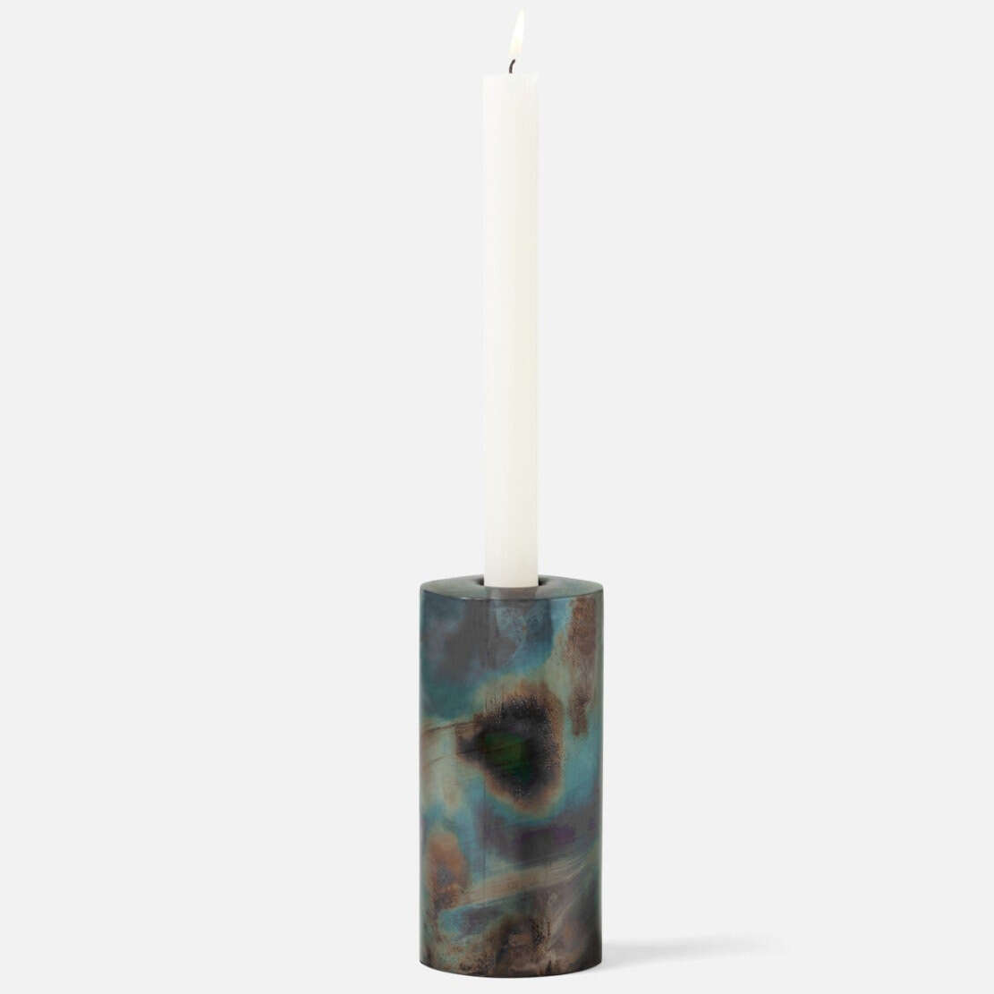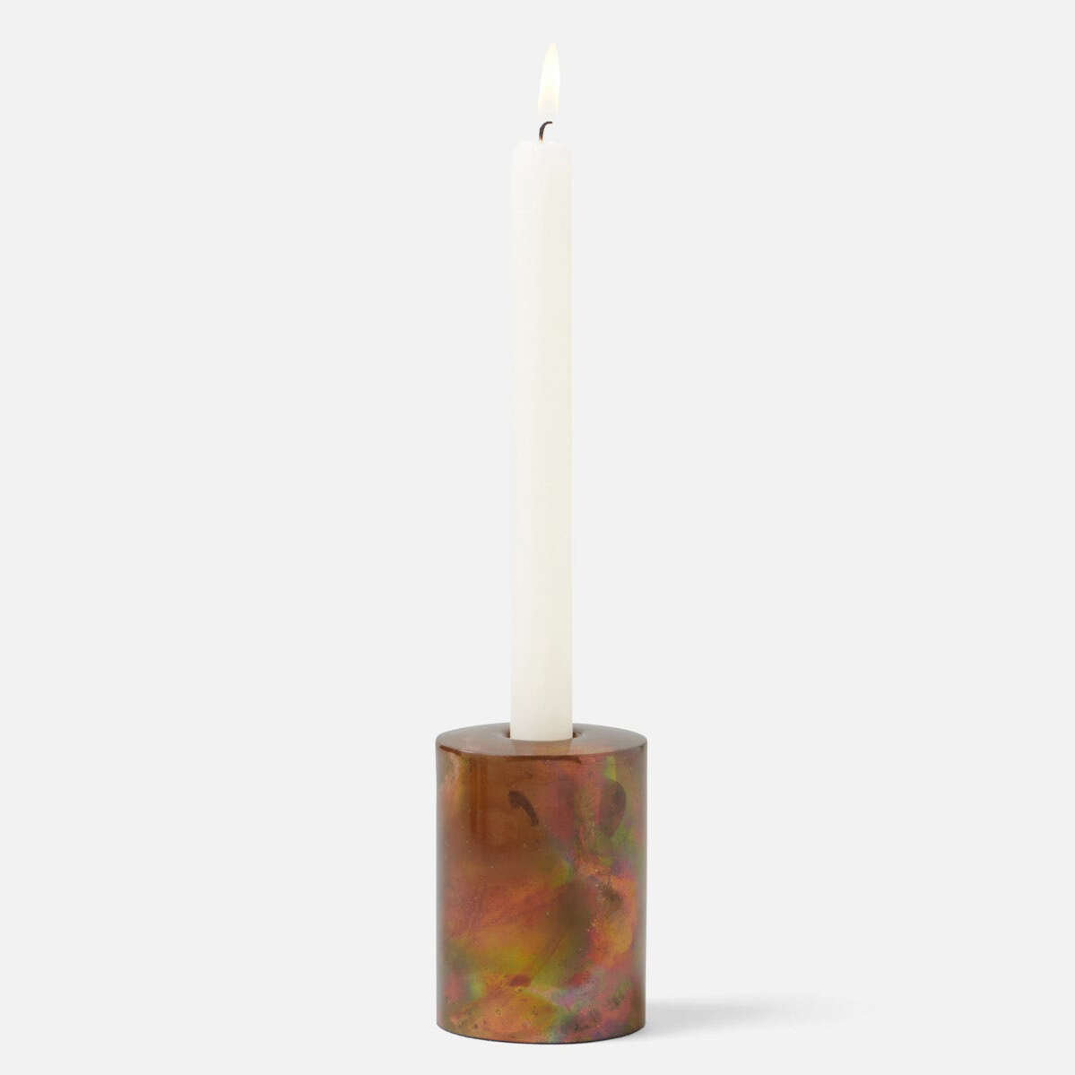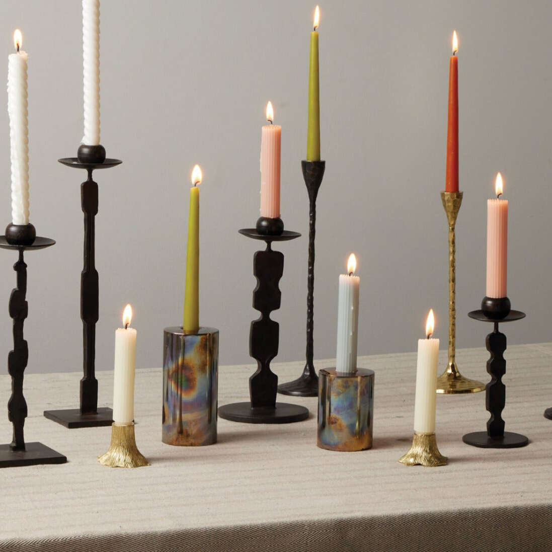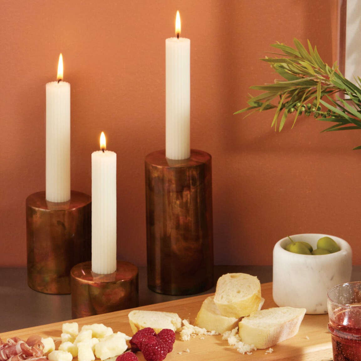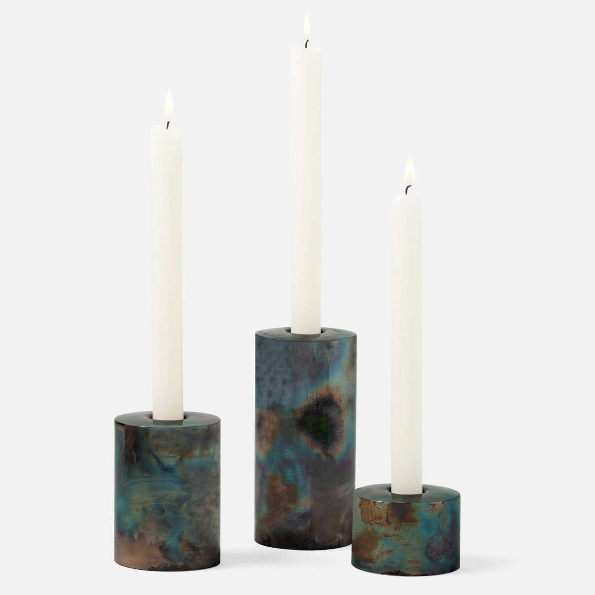 Our minimal, cylindrical Spencer candle holders feature burnt metallic finishes with a smoldering, slick shine. Sets of three stainless steel pieces in ascending heights.