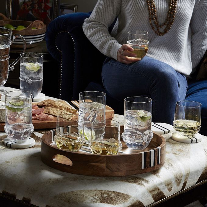 Rich layers of acacia wood and stripes of hand marbled resin are juxtaposed to create the distinct, unique look of our Stonewood Stripe collection. This coaster set features a wood base and four marble coasters that nest inside.