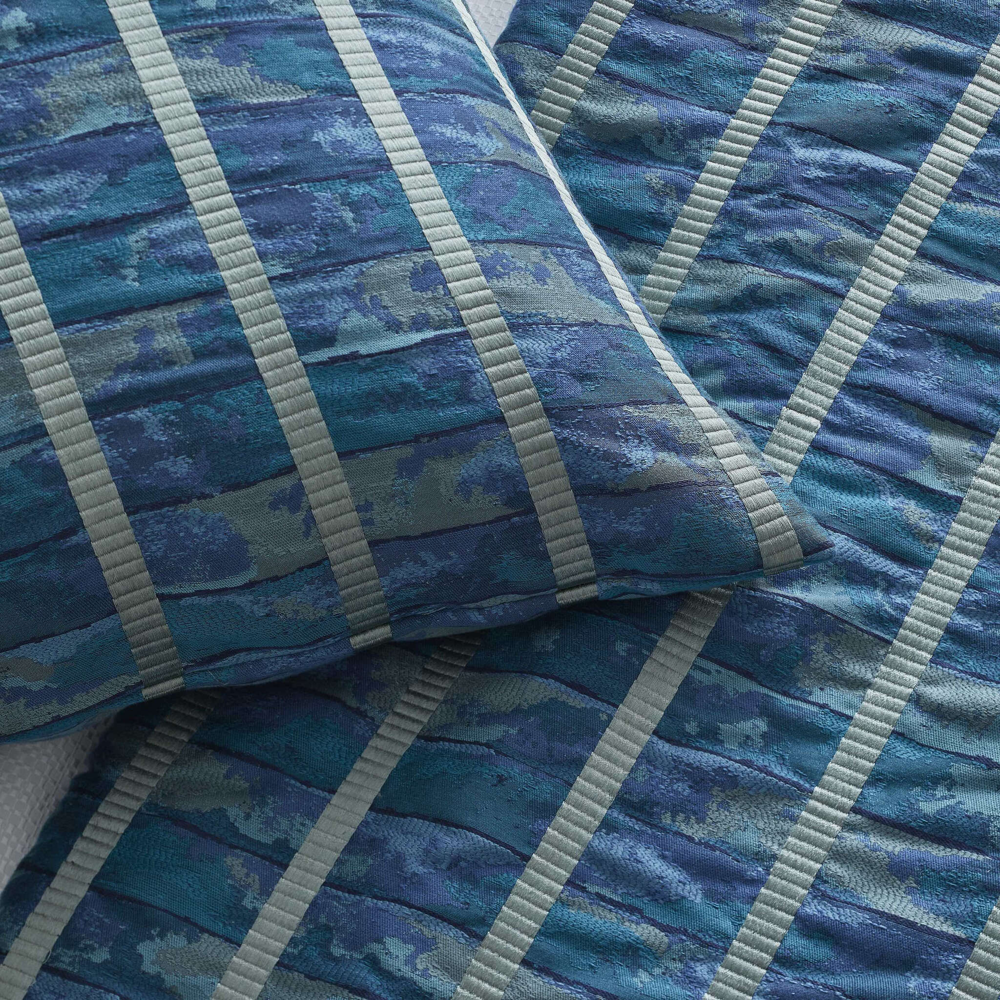 Inspired by a Faience panel from Egypt's OId Kingdom period, we reimagine the shades of azure in a jacquard with embroidered lines.