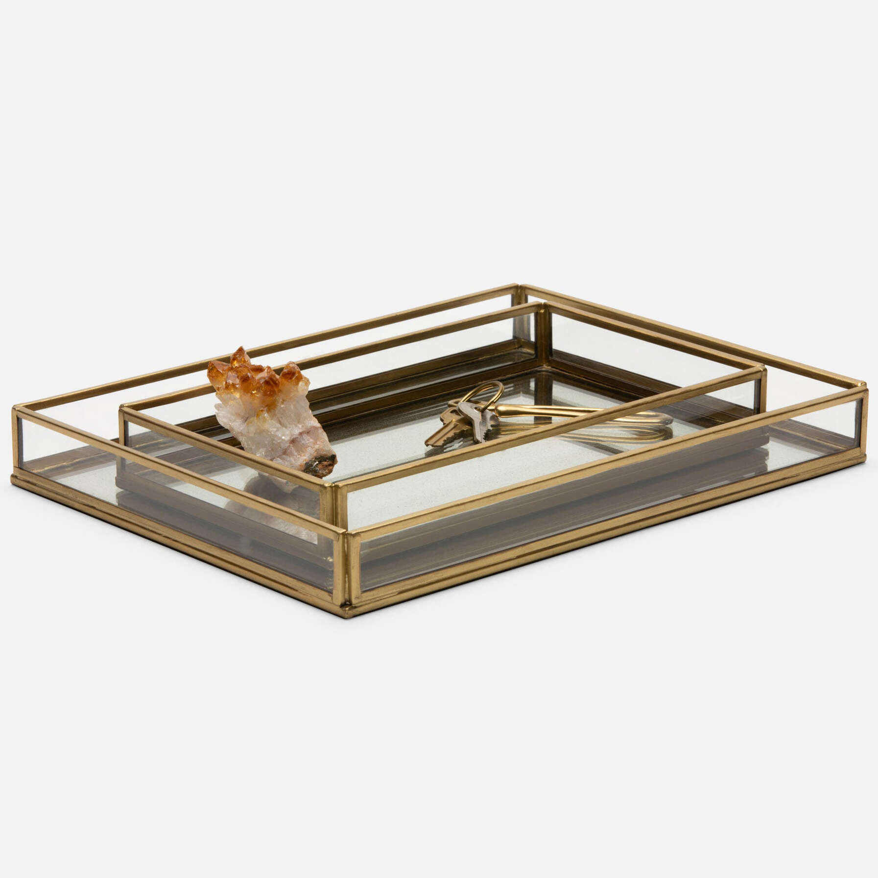 A marriage of antiqued mirror and clear glass with metal trim, these trays elevate any surface.