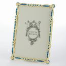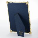 Gold finished pewter picture frame with hand-set blue European crystals. Elegant navy hued moiré silk back, with easel designed for vertical or horizontal placement. Tarnish resistant. Signature luxury gift box included.