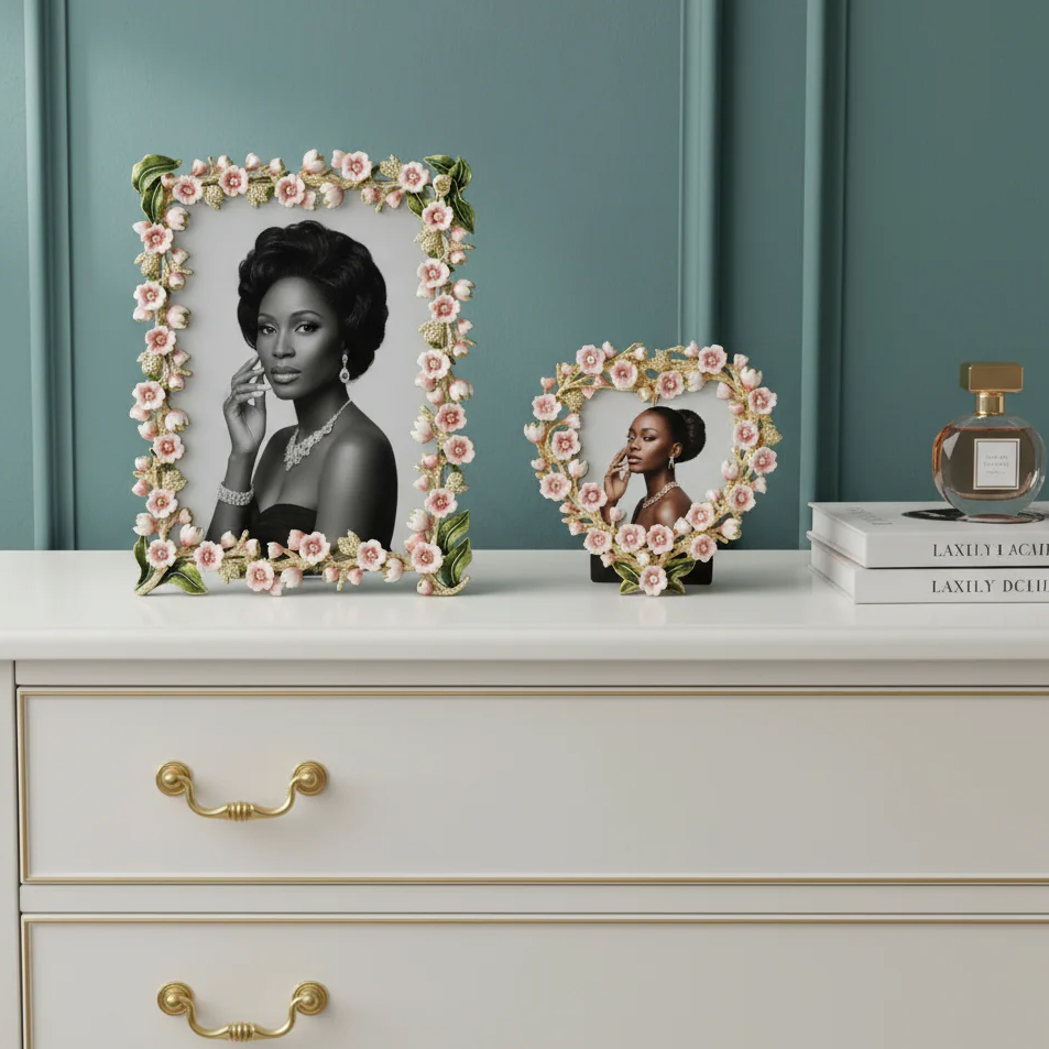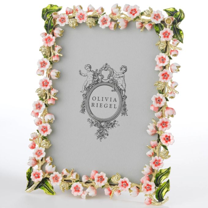 Delightful floral pattern picture frame in gold finished pewter, with pink and green hued hand-enameling and hand-set European crystals. Elegant champagne moiré silk back with easel for vertical or horizontal placement. Tarnish resistant.