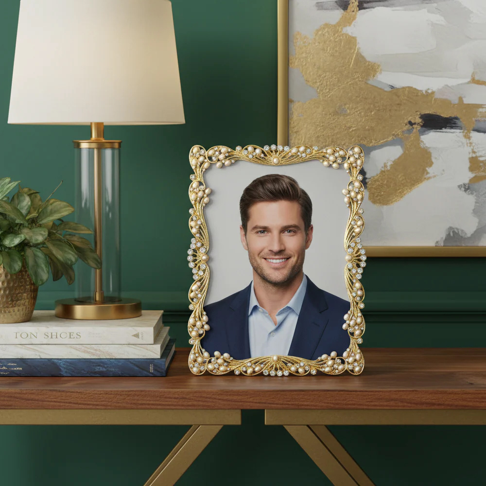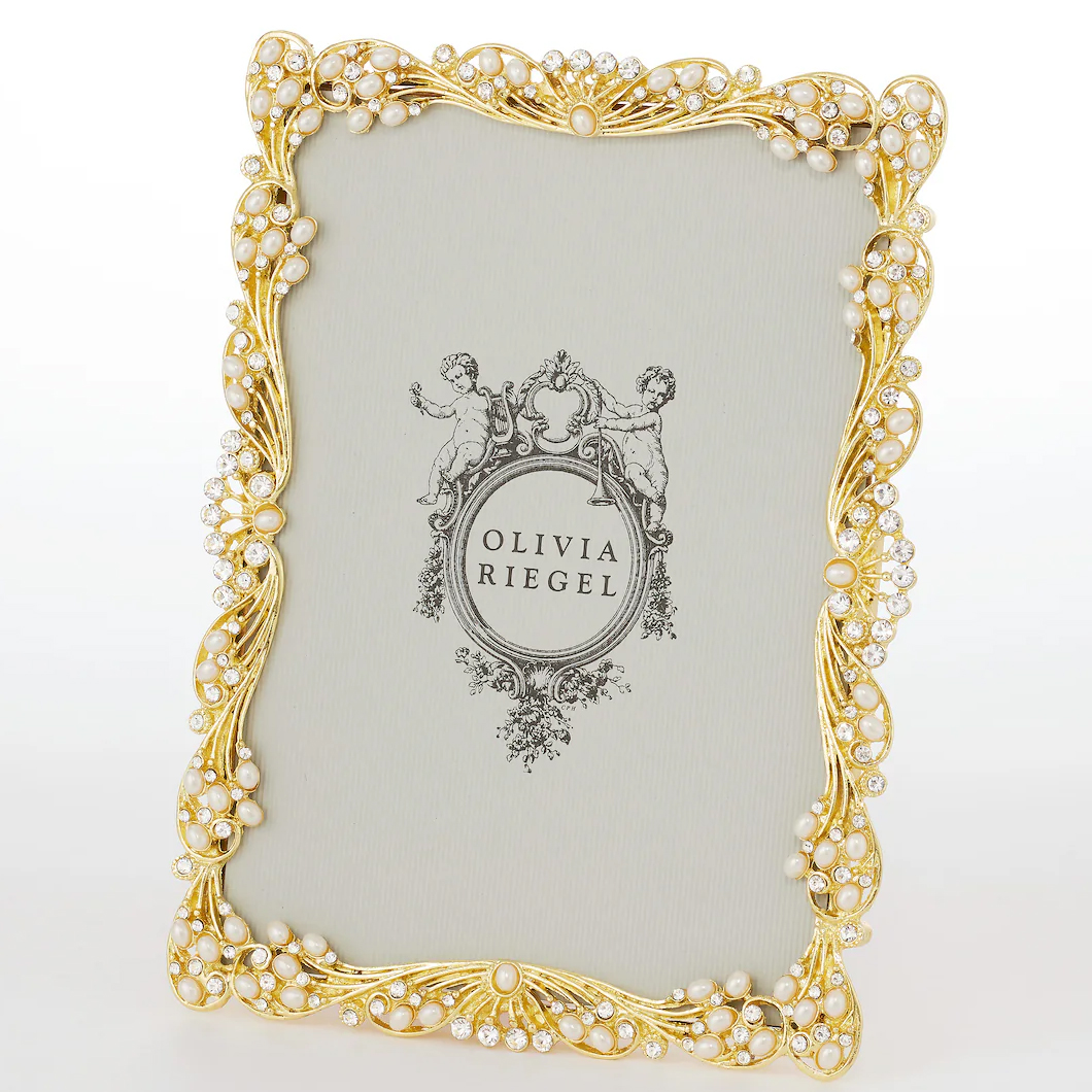 Gold finished pewter filigree work adorned with hand-set clear European crystals and cultured freshwater pearls. Elegant champagne moiré silk back, with easel designed for vertical or horizontal placement. Tarnish resistant. Signature luxury gift box included.