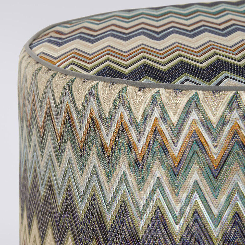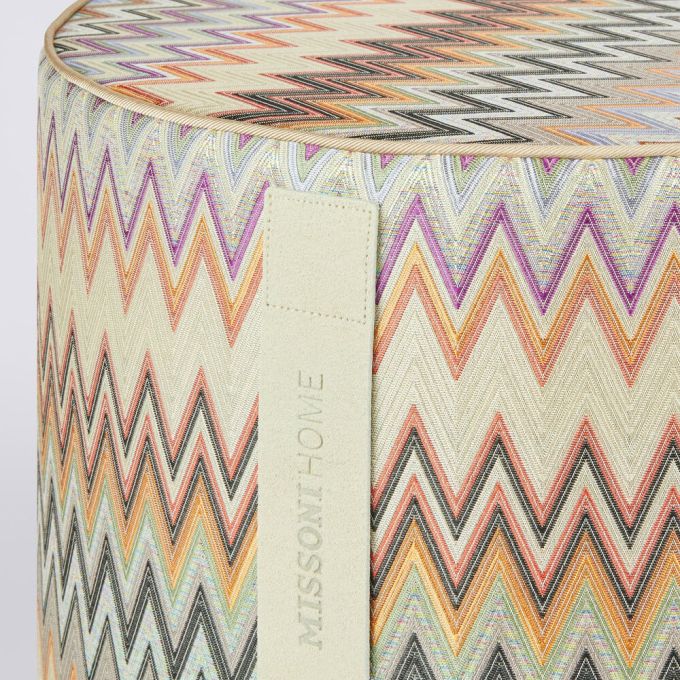 A hypnotic weave, traversed by zigzags, characterises the knitwork of the cylindrical Masuleh pouffe. Made refined by the sheen of the silk in the textile blend, this accessory will add a touch of sophistication to any room in your home.