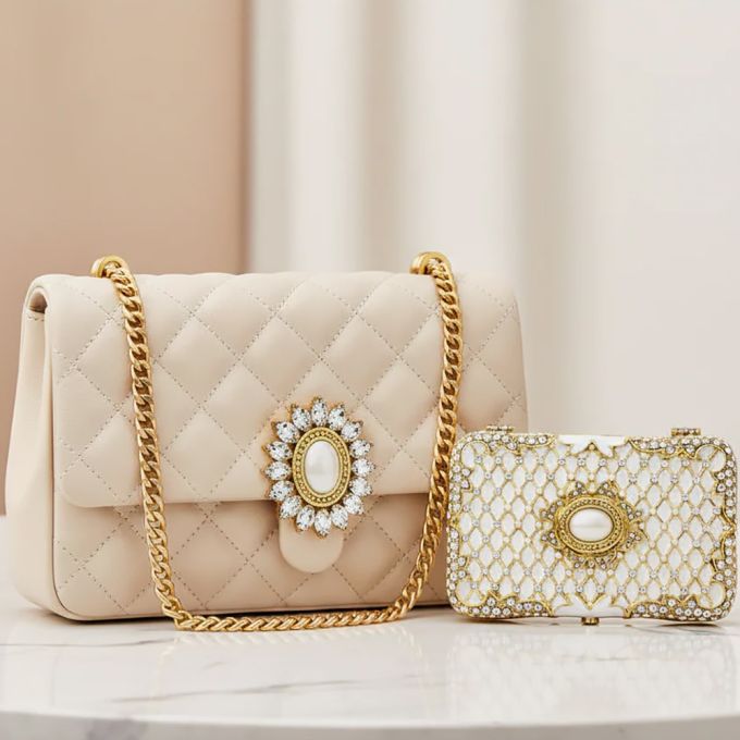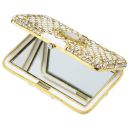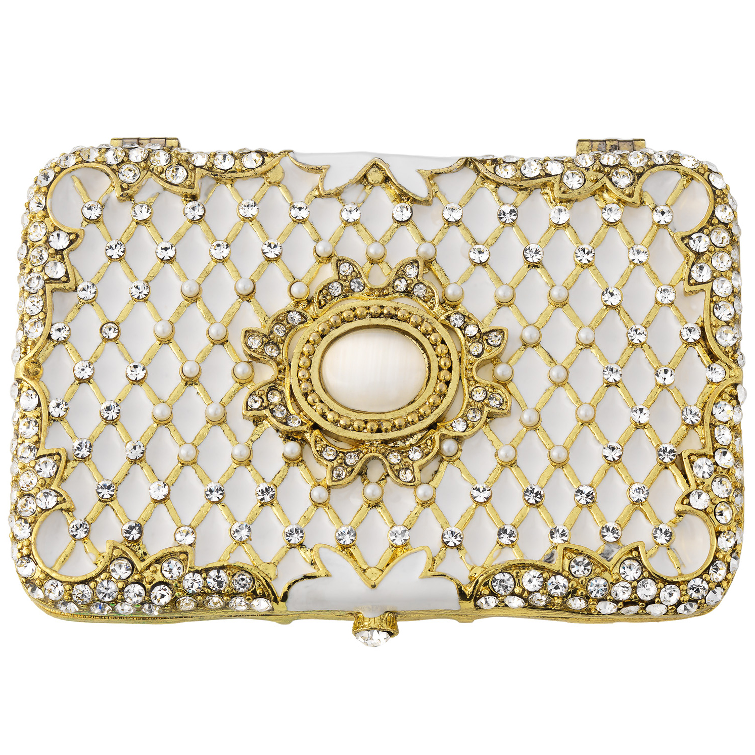 Gold finished cast pewter mirrored compact with white hand-enameling, hand-set clear European crystals, faux pearls, and clear cat's eye cabochon. Opens up to reveal double-sided mirror, with one side at 1x magnification and one side at 2x magnification. Tarnish resistant. Cloth pouch and signature luxury gift box included.