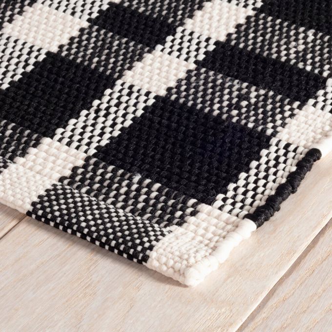 Add a touch of classic style to your high-traffic spaces with this lightweight, washable, and durable indoor/outdoor rug in a timeless yet modern black and ivory plaid.