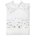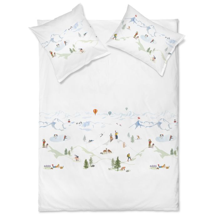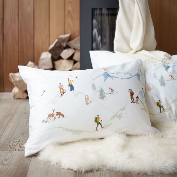 The Swiss mountain panorama and scenery from the alpine sports world define the multifaceted Alpina design. The bed linen shows, as a printed watercolor, all the natural experiences that we love in the mountains and in the valley in winter and summer. Simply breathe in the fresh mountain air and enjoy the beautiful weather. The narrative scenery is accompanied by ibex, deer, fox and rabbit. The pillow and duvet form a sequence of scenes.