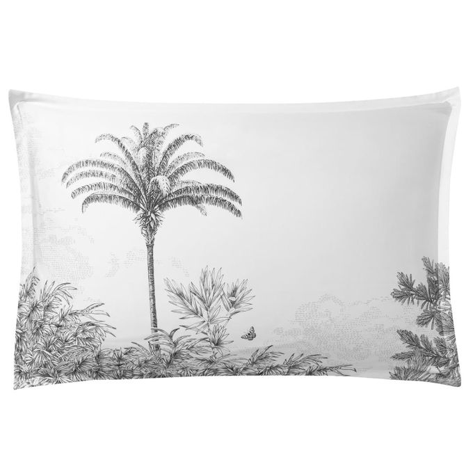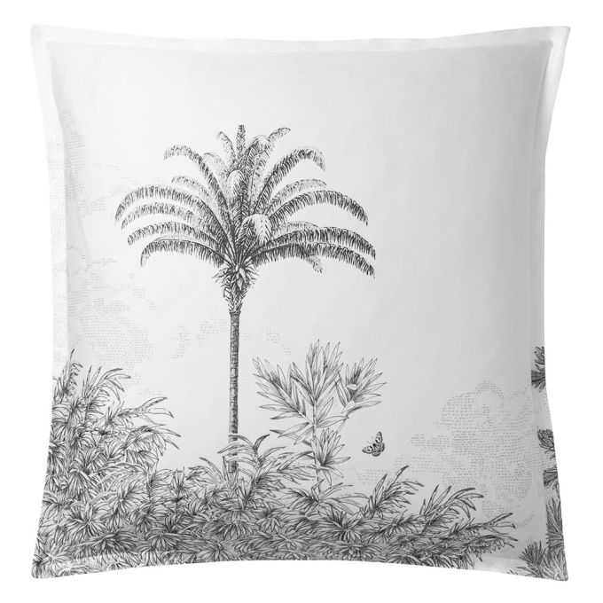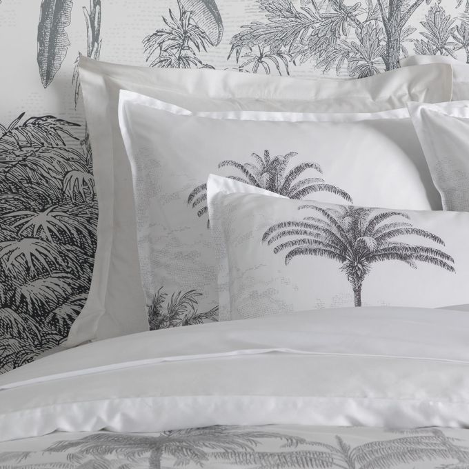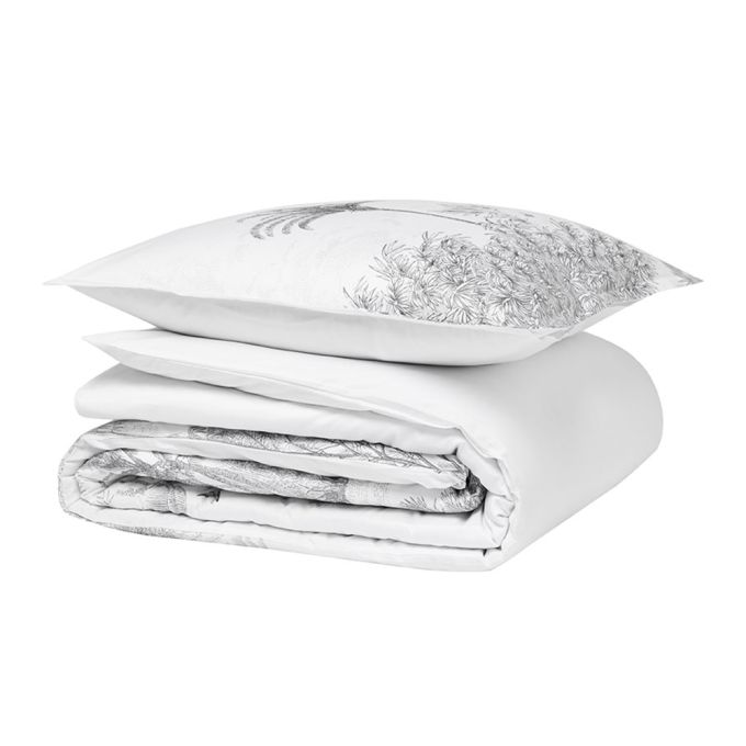 With this model you can go on an expedition along the Amazon River, not far from a rich rainforest. A luxuriant nature in which you may meet some wild and mischievous animals. With a large panoramic backdrop, the bed linen takes on a theatrical look that will have a great effect in the bedroom. A fabulous landscape with an engraved motif in a palette of greys on a pure white background.