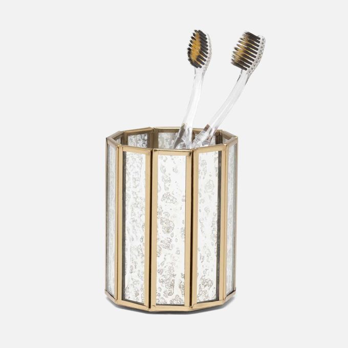 Reflect sophistication and whimsy from all angles with the Grevena. Crafted from individually cut and placed eglomise glass, its geometric design adds dimension and intrigue to any bath.