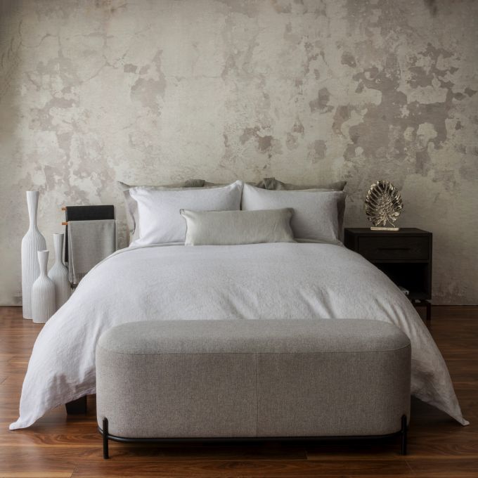 Discover the beauty of monochrome with Halo. A striking combination of minimalist energy with casual sophistication. Halo with its pure milky matte and sheen finish creates a monochromatic scheme delivering comfort and elegance. Expertly crafted with traditional European techniques, Halo combines fine Italian linen with the exquisite Giza Egyptian long staple cotton, delivering a transitional design.