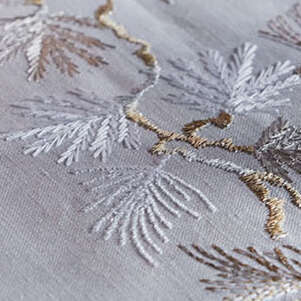 Linen, with its undeniable strength and elegance, is the ideal choice to enhance the table. Ramage, our Maine linen tablecloth, is the most beautiful incarnation of this. Its authentic look and plant motif are characterised by unique French craftsmanship, the Alexandre Turpault touch. Proudly bearing the OFG label, this model boasts remarkable, long-lasting quality, guaranteeing the fabric's durability and strength in the face of repeated use and washing. A sure choice for celebrating the French art of living in style! Take a moment to contemplate the eternal beauty of nature. Ramage, our refined pattern, reveals boundless depth despite its apparent simplicity. Imagine an enigmatic design evoking the tortuous silhouette of a willow branch adorned with chiselled leaves... Feathers flown from the nest, late pine cones, leaves crystallised by frost: the pattern gives free rein to everyone's imagination. This fine tablecloth is a subtle combination of dyed linen and embroidery with contrasting threads. It's available in three different versions, so there's plenty of opportunity to use it all year round.