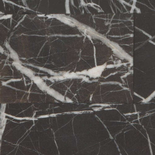 A luxurious bath collection of velvety, white-veined black marble goes next level with a handsome brass trim.