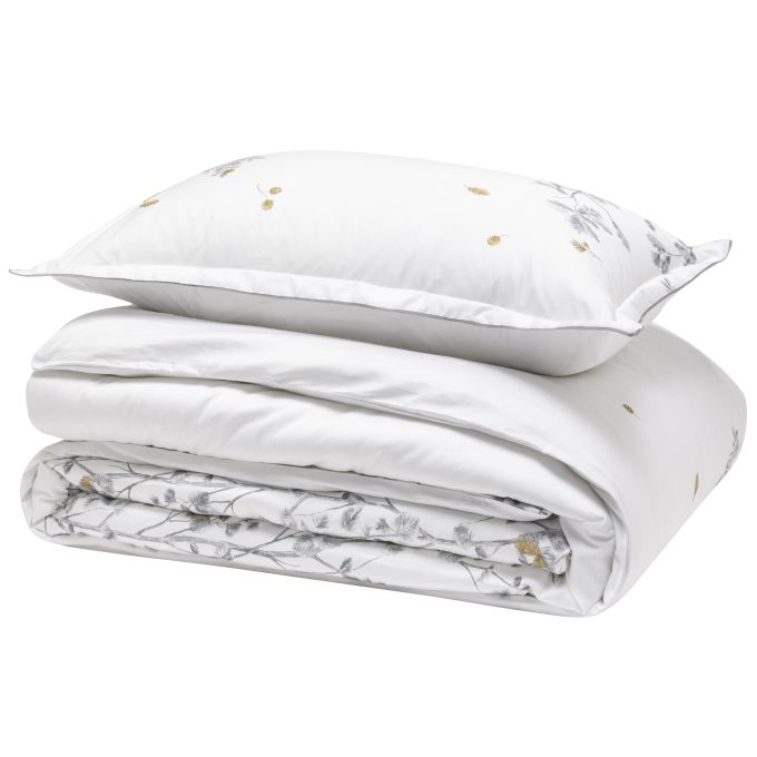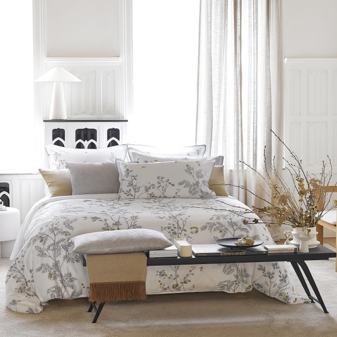 With Saison, we invite you into the sophisticated universe of 18th century French gardens. In this panoramic drawing, a majestic driveway lined with spindle trees stretches before your eyes. Each sheet, drawn by hand in line and ink, comes in a sober palette. From black to white to silver gray gradients, the whole is of a striking depth. A set magnified by delicate embroideries in bronze threads. Seeming to sway in the air, these patterns contribute to the beauty of this pillowcase and its very couture look.
