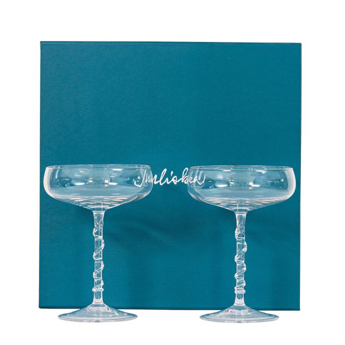 From our Amalia Collection- This set of two traditional coupes, make a celebratory gift. Sip champagne or serve sorbet from the saucer shaped bowl atop a spiraled stem. Our most prolific Bohemian mouth-blown glass collection features an iconic spiral themed design ascending from its base accented with our signature berry.Gift boxed.