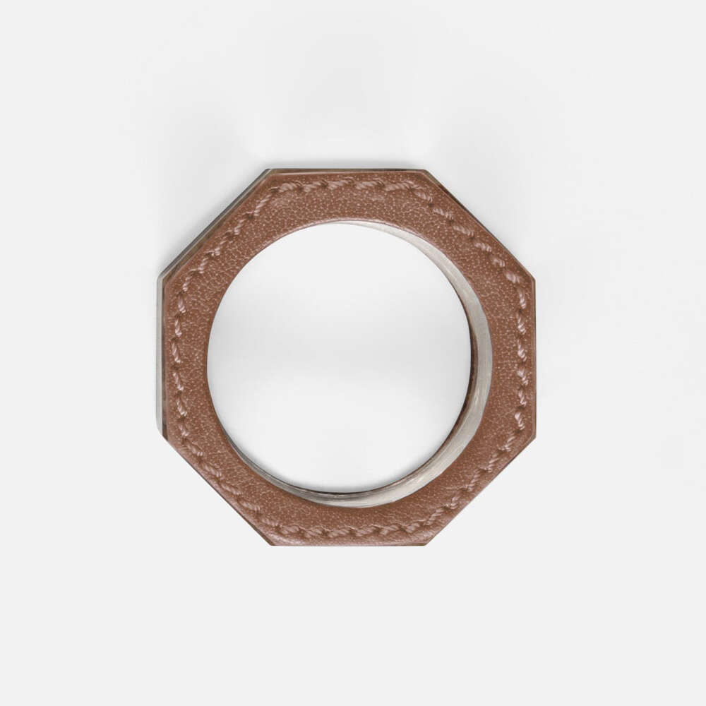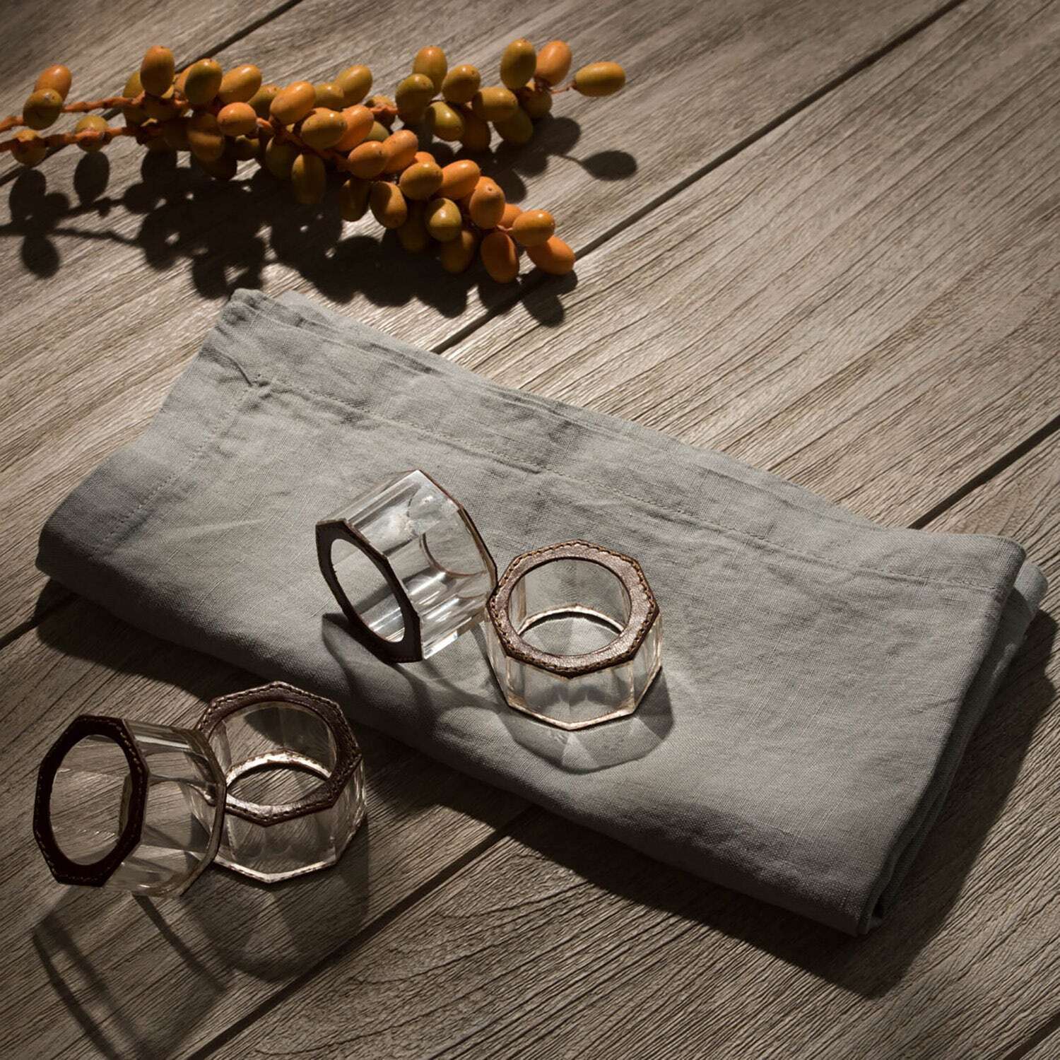Box set of four glass crystal napkin rings with full-grain leather detail.