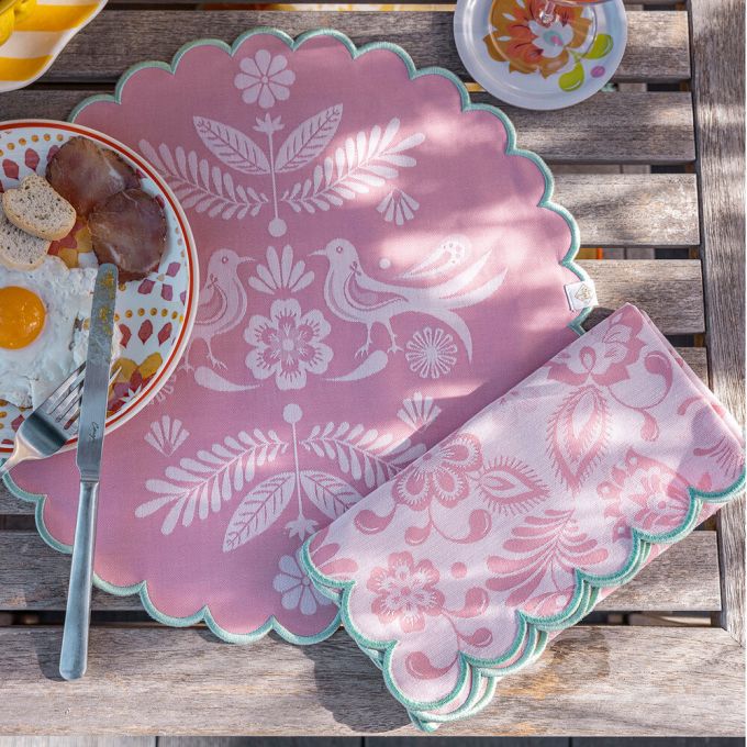 Nature awakens in celebration, bathed in light and sunshine, and steps in to dance within your home. The patterns of the Alegria collection, inspired by the magic of Tenango embroidery from Mexico, reinvent themselves with every glance. Feathers, flowers, leaves, and birds intertwine against vibrant backgrounds, and each piece is edged with a contrasting scalloped finish, radiating a burst of vivid colors that stir the senses and invite you to dream.