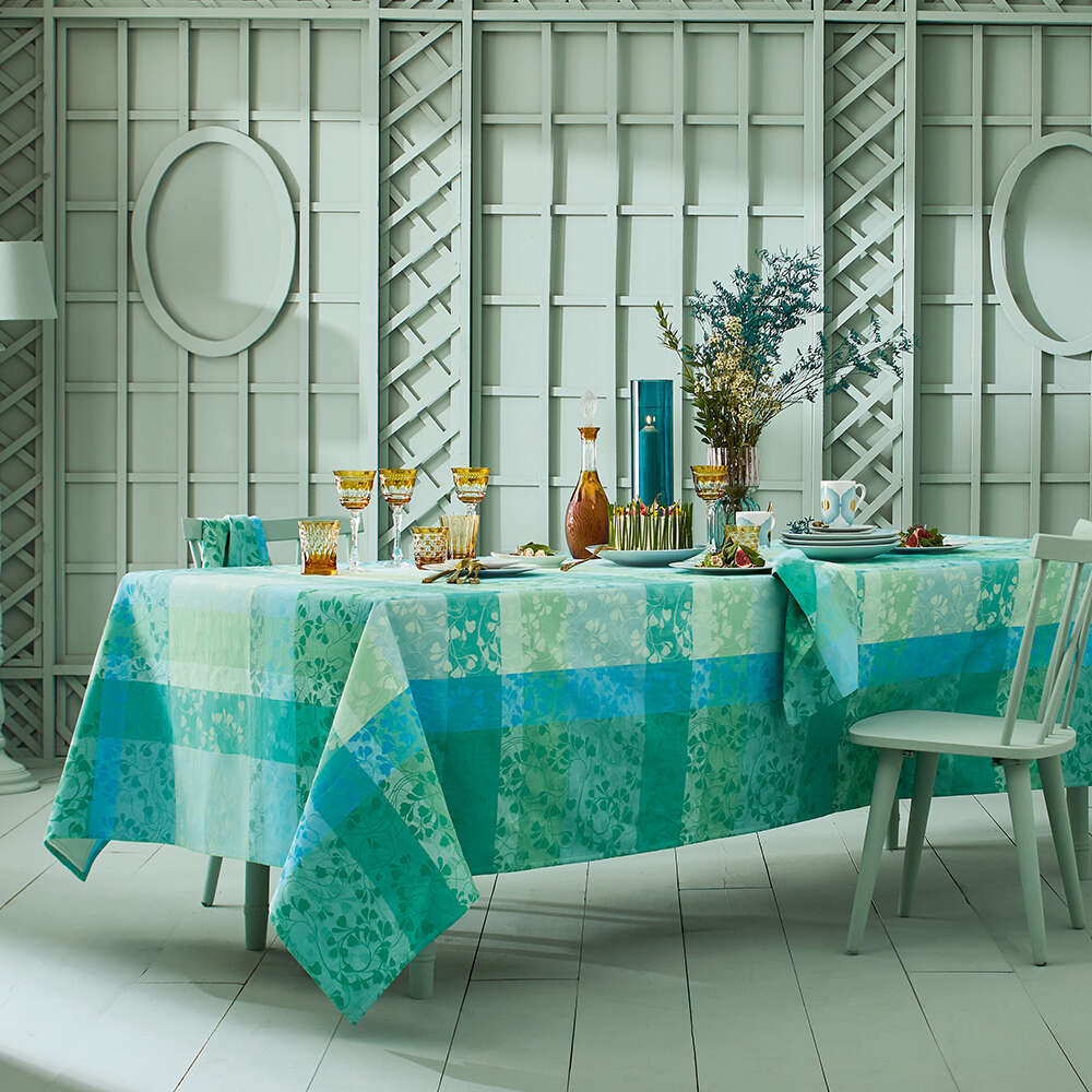 Curate the perfect table with the Mille Feuillages Turquoise Tablecloth by Garnier Thiebaut. This design features intertwining turquoise leaves in shades of green, blue, and cream, woven using jacquard looms with extra-long staple cotton for durability. Hand-drawn by in-house artisans, this tablecloth blends timeless artistry with lasting quality, ideal for any occasion.