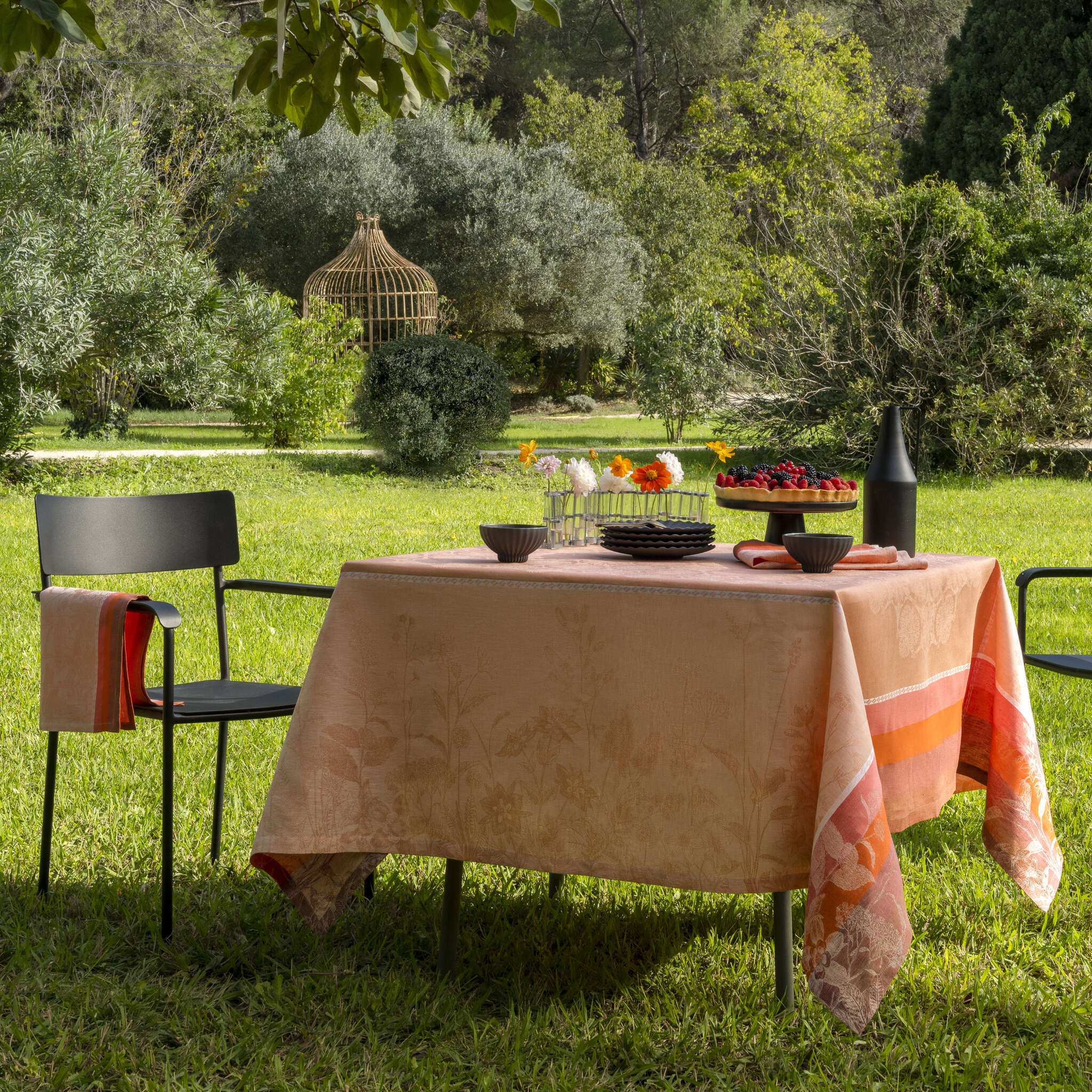 Treat yourself to a countryside moment with our Instant Bucolic tablecloth. For a summer escape in the heart of the countryside magnified by the art of Jacquard weaving which is revealed through a subtle gradation of stripes in seasonal colors. You can complete your table with the napkins of the same collection!