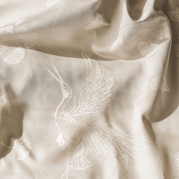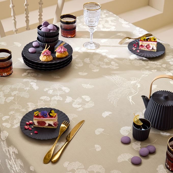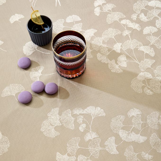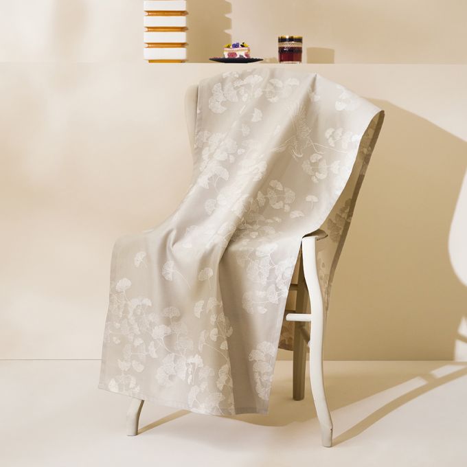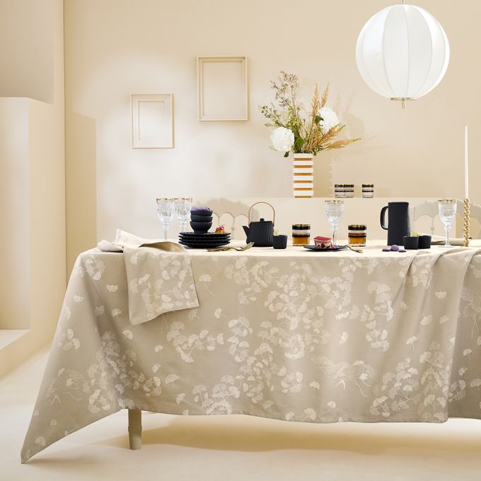Create an elegant, airy table setting with the Mille Ginkos Naturel Tablecloth by Garnier Thiebaut. Featuring delicate ginkgo flowers flowing through the light air in soft shades of cream and Grey, this jacquard-woven design is crafted in France from extra-long staple cotton. Designed by our in-house artisans, it combines timeless beauty with lasting durability for every occasion.