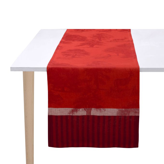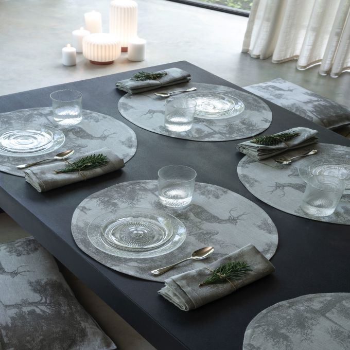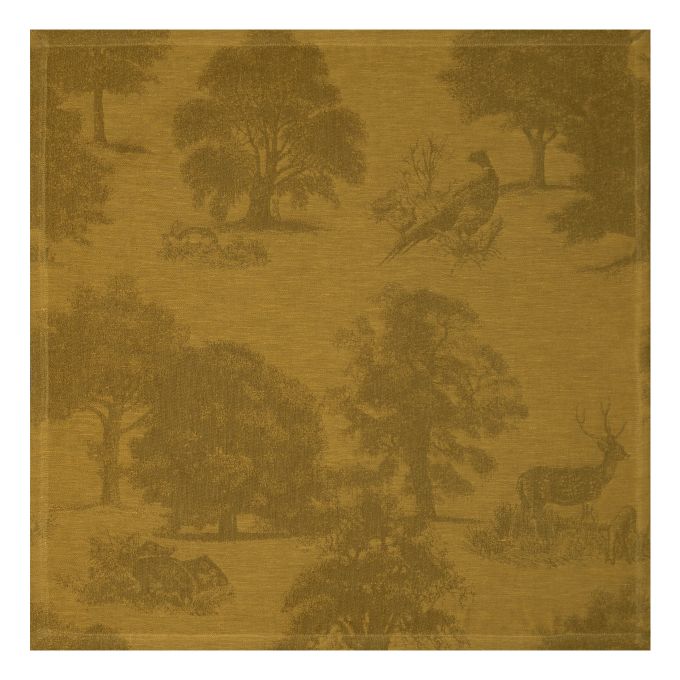 Our Souveraine collection will immerse you in the heart of a magical, enchanting forest. Let yourself be seduced by our 100% linen tablecloth and its panorama of greenery. This delicate tablecloth is like a toile de Jouy, where pheasants, wild boar, fawns and hares bask in the midst of luxuriant vegetation abounding in beauty. To complete this universe, you can opt for napkins from the same collection!