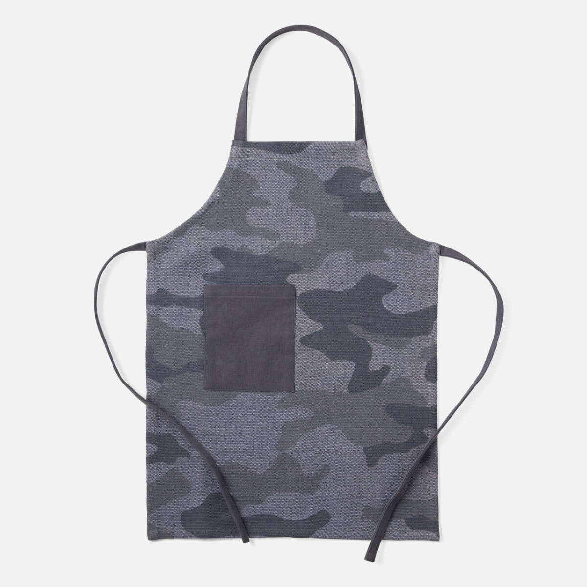 Our Jaylen aprons display a grey camouflage pattern instead of kitchen messes. Available in adult and child sizes.